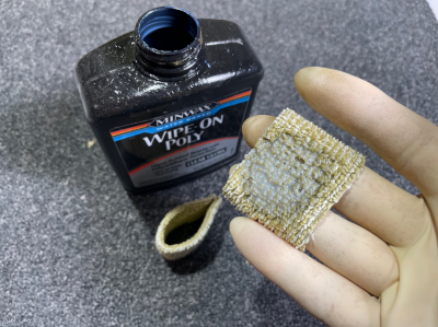 Το πανάκι για το βερνίκι είναι μια λωρίδα από παλιά πετσέτα (όμως πλυμένη και καθαρή) που έχει συρραφτεί με κοινό συρραπτικό ώστε να έχει σχήμα δαχτυλιδιού σε μέγεθος που ταιριάζει να φορεθεί στα δυο μεσαία δάχτυλα. Ακούγεται κάπως «προχωρημένο», αλλά στην πράξη χρειάστηκε να μπορεί να κρατιέται με ασφάλεια το πανάκι στο χέρι διότι το βερνίκι στεγνώνει αρκετά γρήγορα, και μπορεί δουλεύοντάς το να «φρενάρει» ή και να κολλήσει στη επιφάνεια με αποτέλεσμα να ξεγλιστρήσει απ’ το χέρι προκαλώντας μια τοπική καταστροφή. Επί πλέον, μου επέτρεψε να δουλεύω το υλικό απαλά, σχεδόν χαϊδεύοντάς το, και στρώνοντάς το για 1~2 λεπτά μέχρι να «κάνει πέτσα» και να μη κολλάει πλέον.