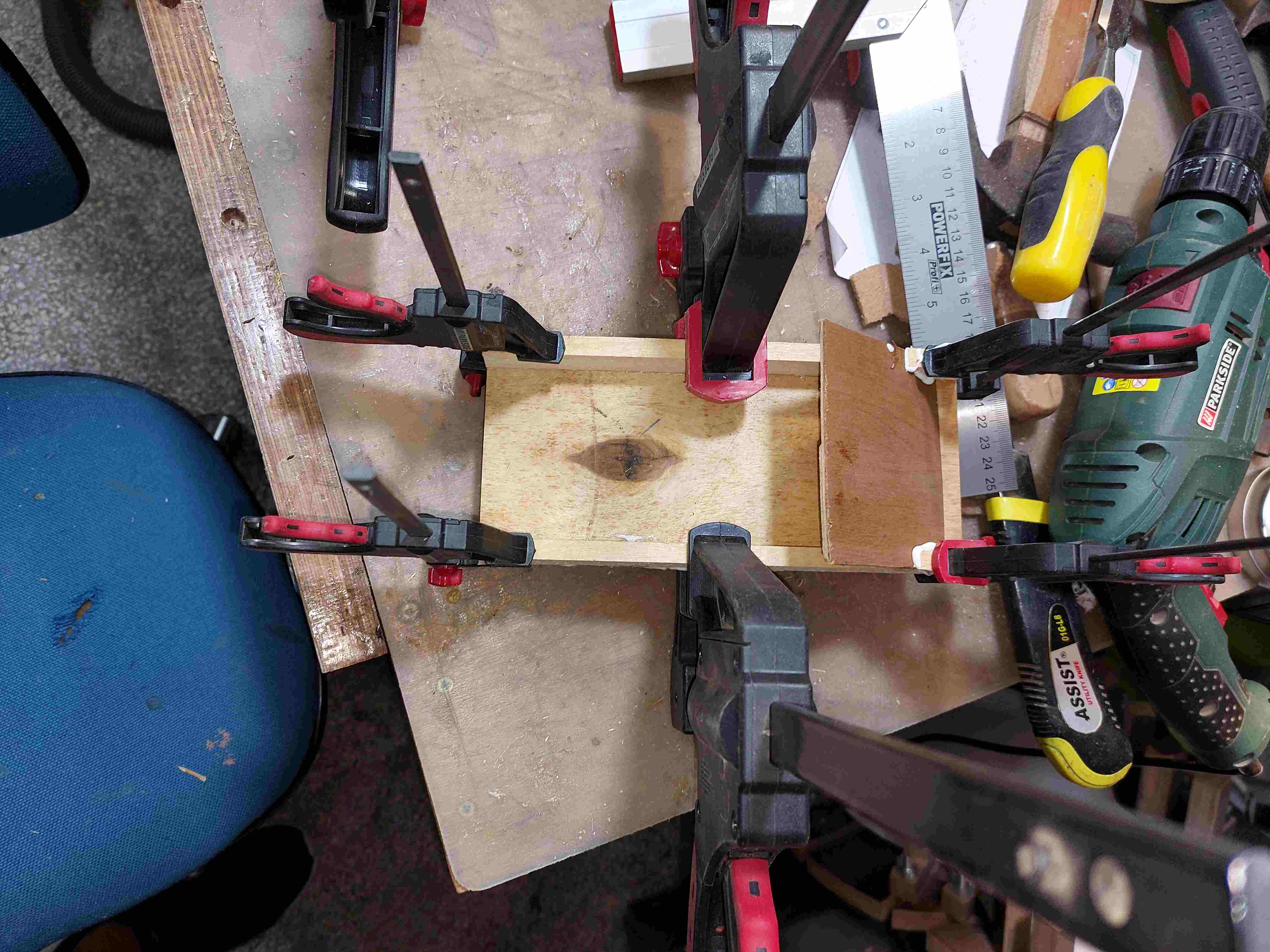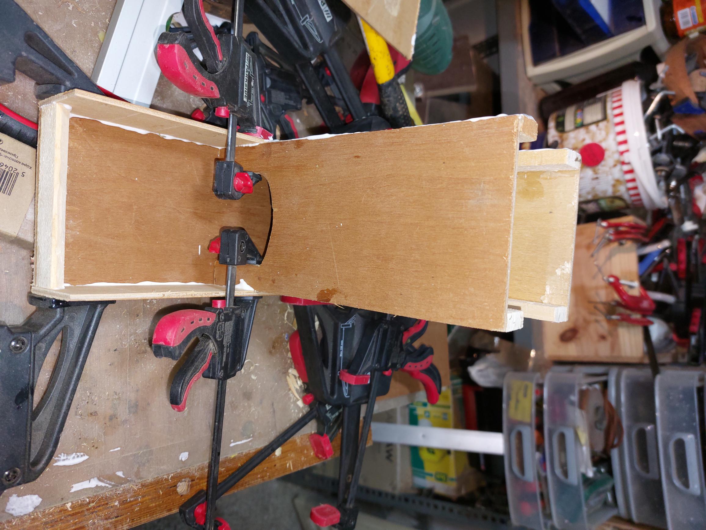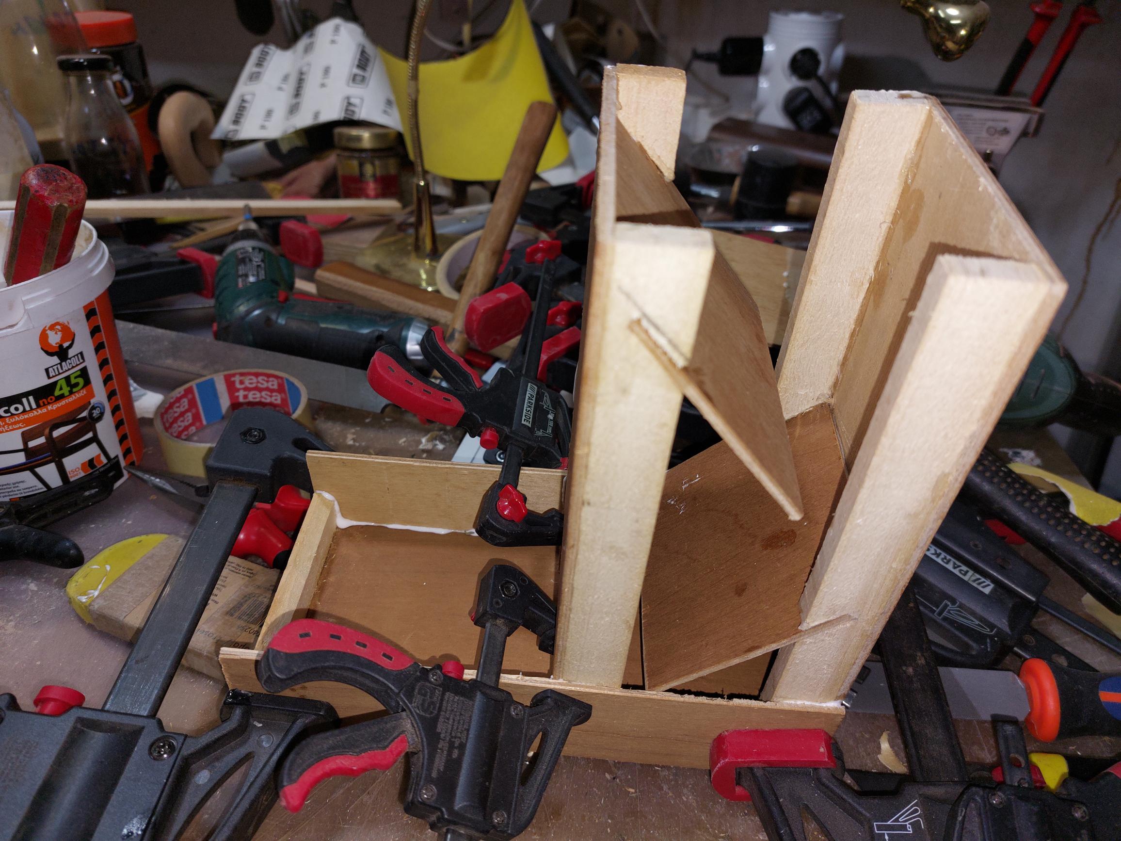Με βαλατε στην μπριζα και πλακωθηκα να το τελειωσω. Κολληματα τελος. Η κατασκευη παραμενει στους σφιγκτηρες να στεγνωσουν οι κολλες. Μενουν τριψιματα και λουστρα. Ανεβαζω και 2 ακομη φωτογραφιες απο την κατασκευη.