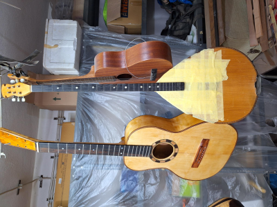 Κρεμασνενο στο τσιγκελι αφου εβγαλα τα παλια ταστα κα καλυψα το καπακι για να μην τραυματιστει. Μαζι κι η τελευταια κιθαρα στα λουστρα πριν πεταστουν χορδες, κι ενα γιουκαλιλι που επισκευσσα και περιμενει να περαστουν χορδες.