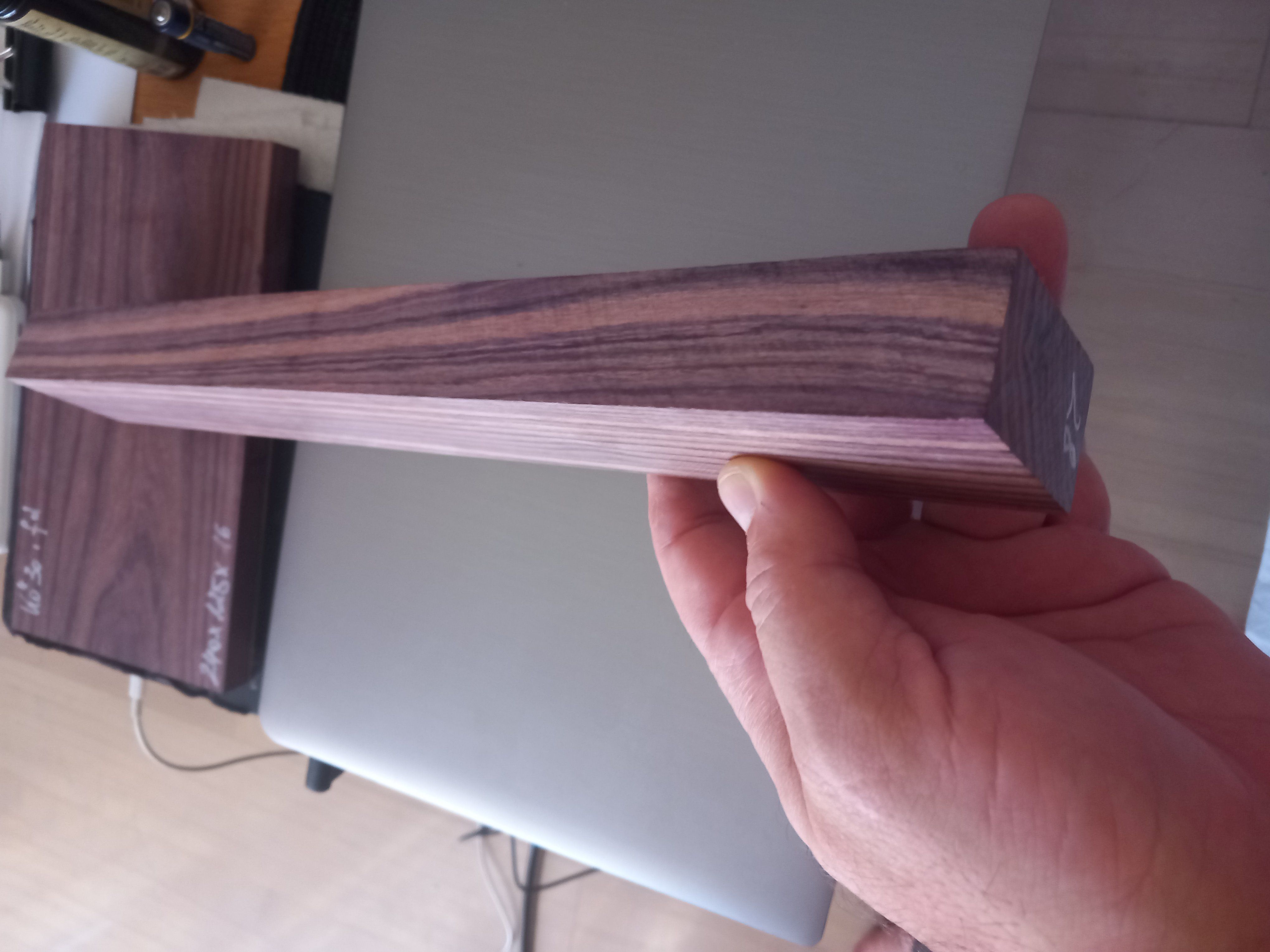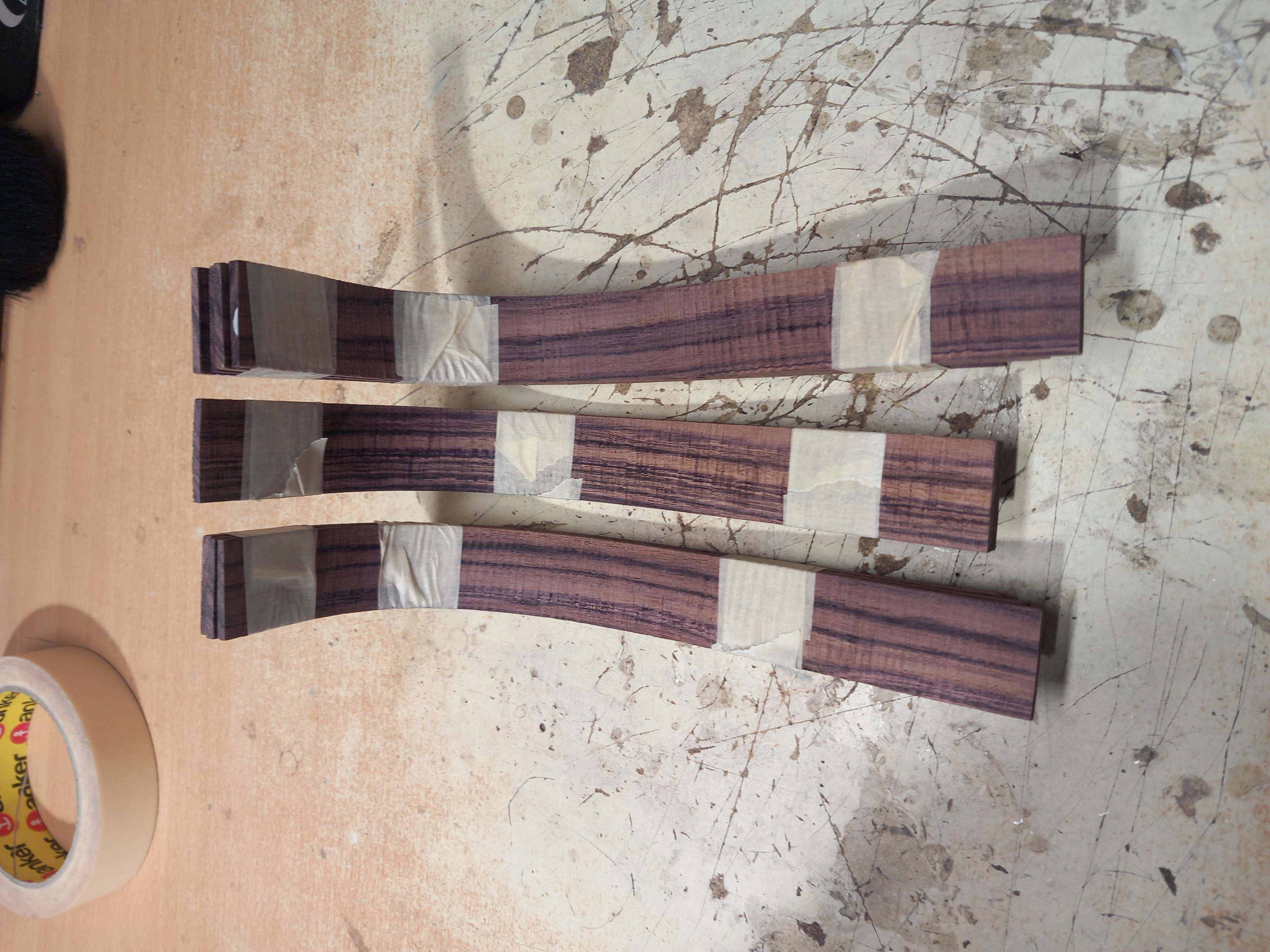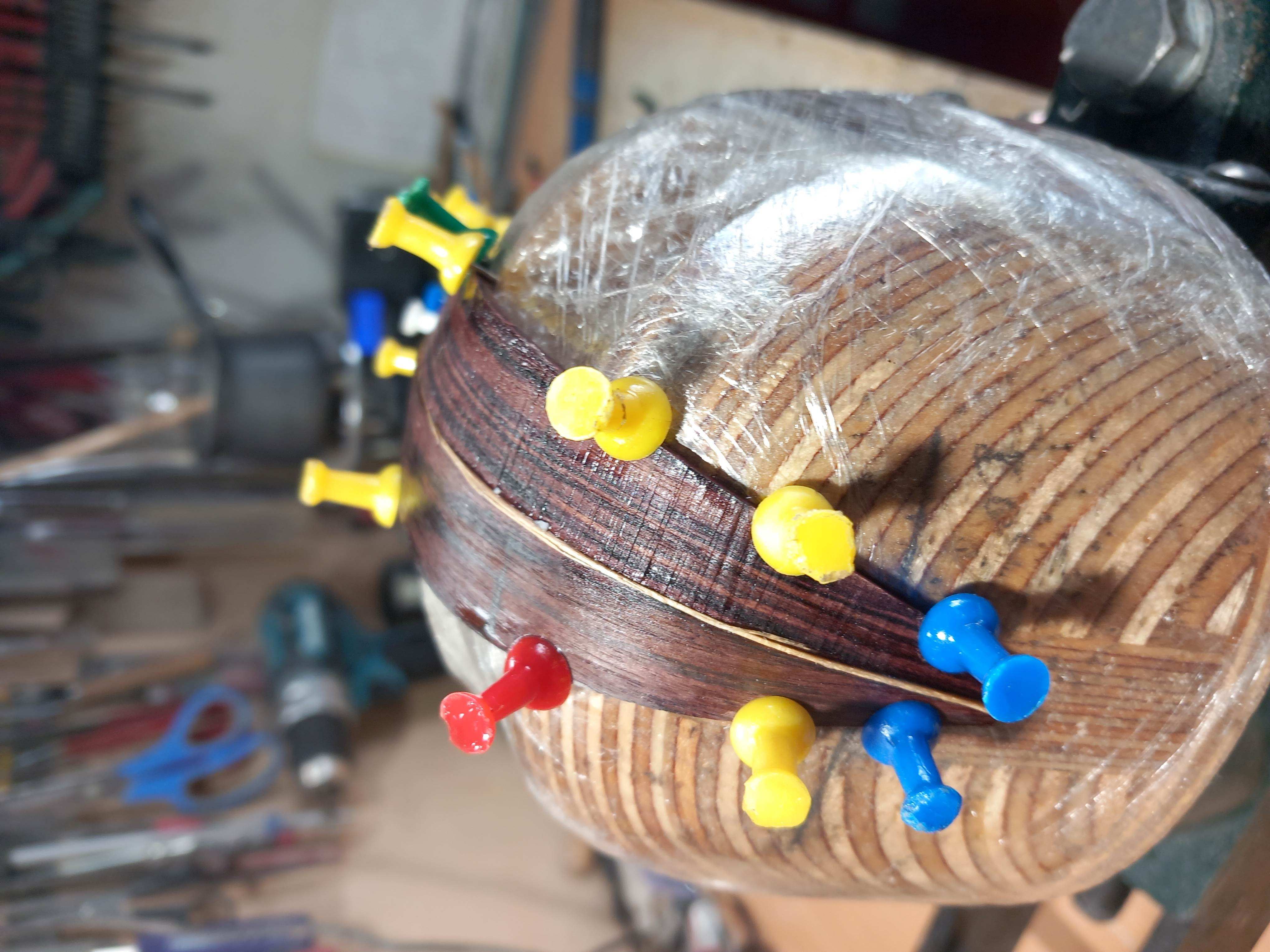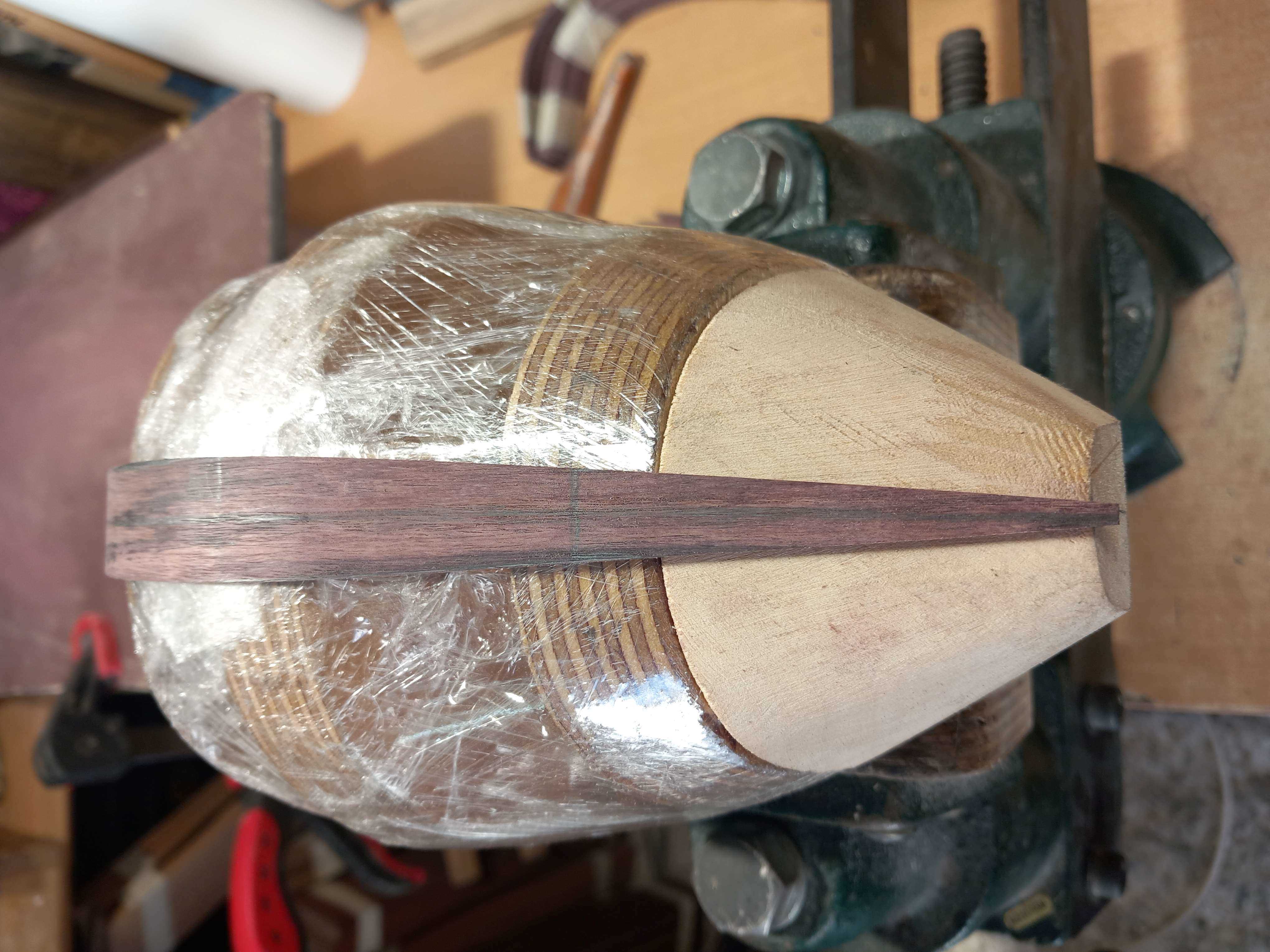 Ξέρω έχω απουσίες πολλές....Δεν θέλω να πω δικαιολογίες για δουλειά κλπ...όλοι μας έχουμε από κάτι.  Έψαχνα καιρό να βρω ένα συγκεκριμένο ξύλο που δυστυχώς δεν έχω βρει ακόμη σε μεγάλα κομμάτια παρά μόνο για μπαγλαμά. Ονομάζεται Kingwood και είναι κάποιο είδος rosewood. Έχει αυτό το βιολετί μωβ χρώμα που εμένα μου αρέσει πάρα πολύ. Μοιάζει κάπως με αυτόν τον μελιτζανί παλίσανδρο που ψάχνουμε όλοι μας να βρούμε.Το βρήκα κάπου στη Γερμανία (πανάκριβο) και βγαίνει για δυο μπαγλαμάδες ίσα ίσα. Κόστος ανά μπαγλαμά περίπου 35 ευρώ... Τέλος πάντων επειδή είχα φάει κόλλημα να δω αυτό το ξύλο από κοντά το πήρα απόφαση και το αγόρασα. Λοιπόν ...το ξύλο είναι πολύ σκληρό. Κόβεται σχετικά δύσκολα αλλά προς ευχάριστη έκπληξη λυγίζει εύκολα. Αυτή ήταν και η μόνη μου ανησυχία γιατί φοβόμουν πάρα πολύ μην σπάει στην προσπάθεια να το λυγίσω αφού ο μπαγλαμάς έχει απότομη κλίση στην περιοχή της κολάντζας. Καταλήγοντας σαν ξύλο δουλεύεται εύκολα και δεν βρήκα προβλήματα στη διαδικασία. Παραθέτω πληροφορίες που αφορούν το ξύλο και κάποιες από τις ιδιότητές του. https://www.wood-database.com/kingwood/ .