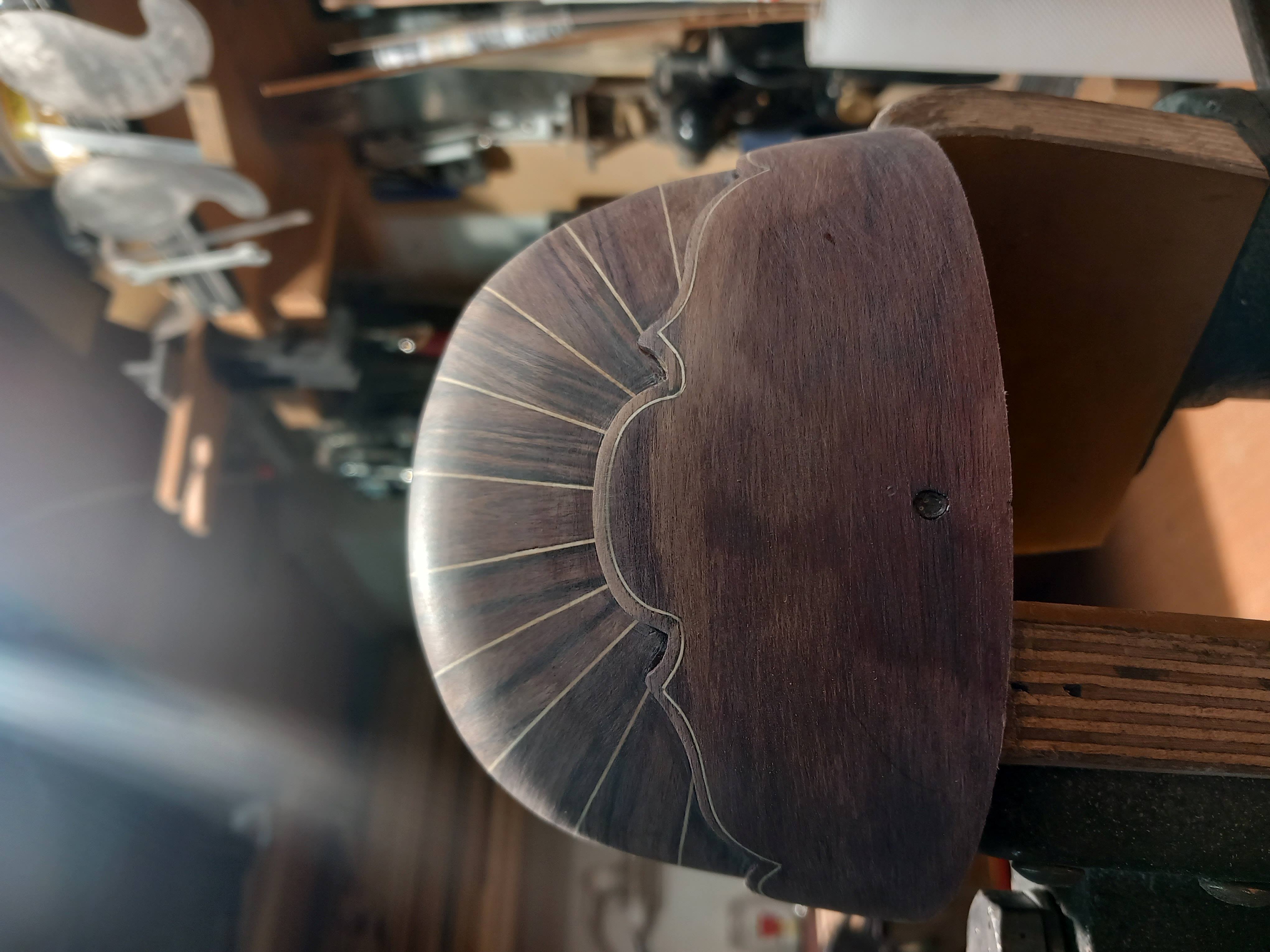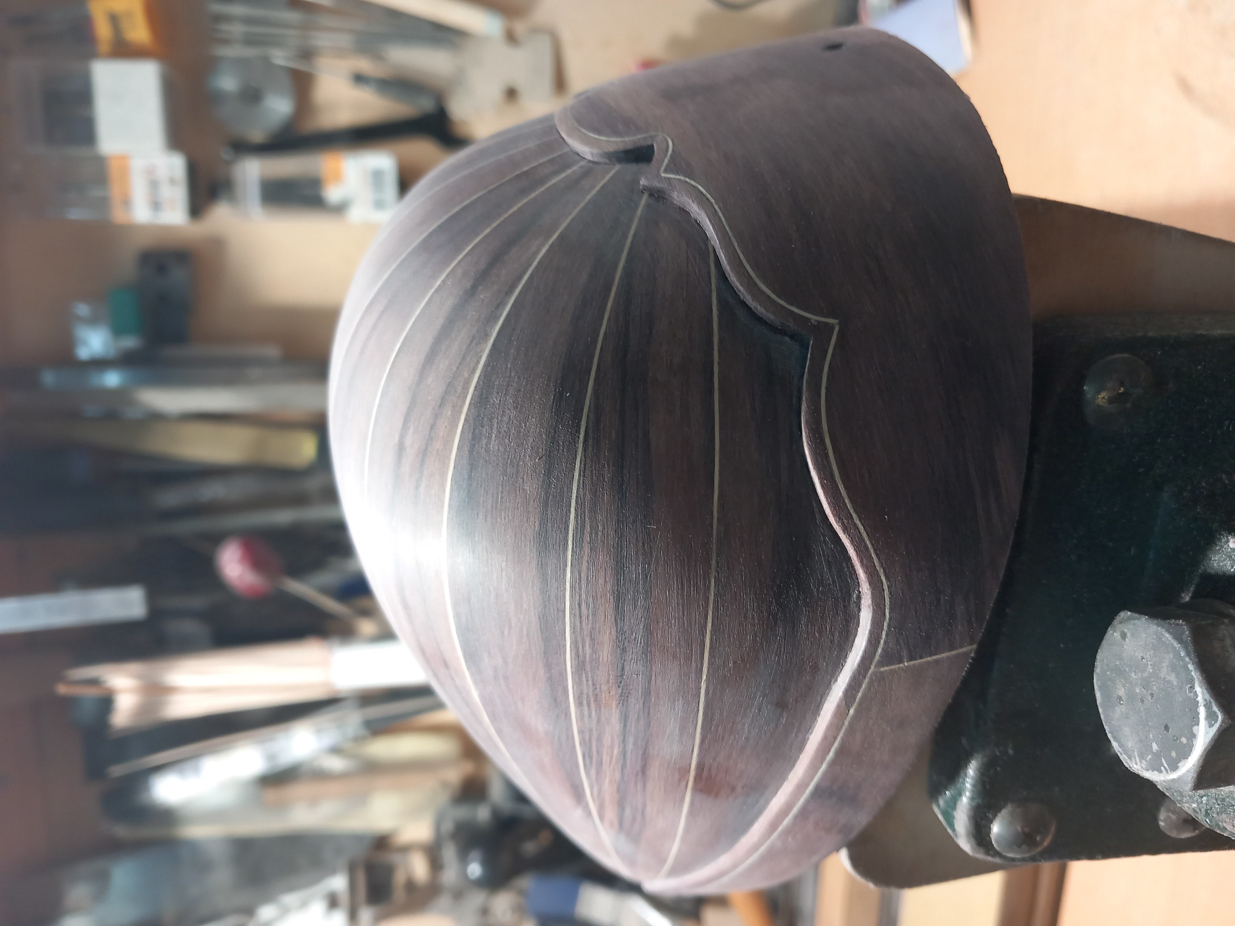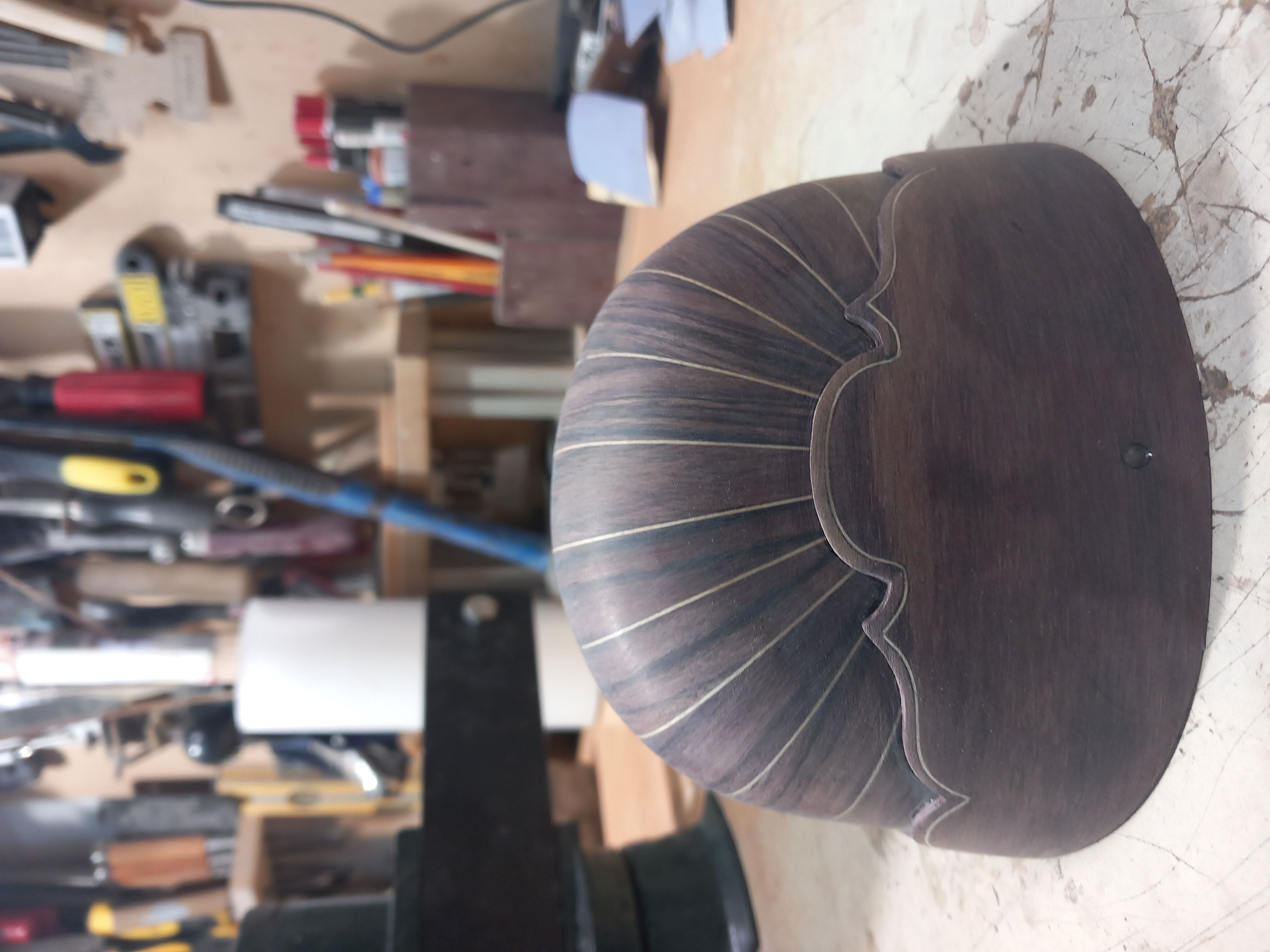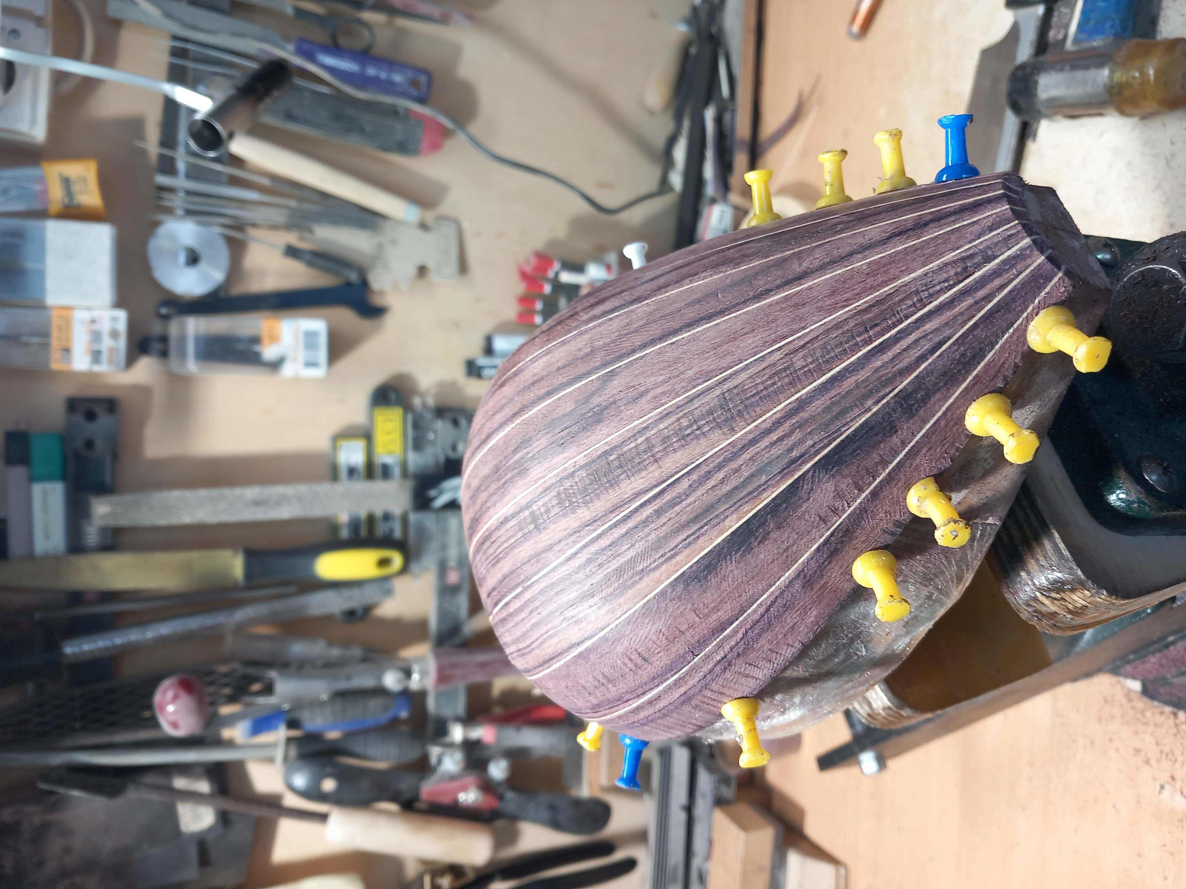 Ξέρω έχω απουσίες πολλές....Δεν θέλω να πω δικαιολογίες για δουλειά κλπ...όλοι μας έχουμε από κάτι.  Έψαχνα καιρό να βρω ένα συγκεκριμένο ξύλο που δυστυχώς δεν έχω βρει ακόμη σε μεγάλα κομμάτια παρά μόνο για μπαγλαμά. Ονομάζεται Kingwood και είναι κάποιο είδος rosewood. Έχει αυτό το βιολετί μωβ χρώμα που εμένα μου αρέσει πάρα πολύ. Μοιάζει κάπως με αυτόν τον μελιτζανί παλίσανδρο που ψάχνουμε όλοι μας να βρούμε.Το βρήκα κάπου στη Γερμανία (πανάκριβο) και βγαίνει για δυο μπαγλαμάδες ίσα ίσα. Κόστος ανά μπαγλαμά περίπου 35 ευρώ... Τέλος πάντων επειδή είχα φάει κόλλημα να δω αυτό το ξύλο από κοντά το πήρα απόφαση και το αγόρασα. Λοιπόν ...το ξύλο είναι πολύ σκληρό. Κόβεται σχετικά δύσκολα αλλά προς ευχάριστη έκπληξη λυγίζει εύκολα. Αυτή ήταν και η μόνη μου ανησυχία γιατί φοβόμουν πάρα πολύ μην σπάει στην προσπάθεια να το λυγίσω αφού ο μπαγλαμάς έχει απότομη κλίση στην περιοχή της κολάντζας. Καταλήγοντας σαν ξύλο δουλεύεται εύκολα και δεν βρήκα προβλήματα στη διαδικασία. Παραθέτω πληροφορίες που αφορούν το ξύλο και κάποιες από τις ιδιότητές του. https://www.wood-database.com/kingwood/ .