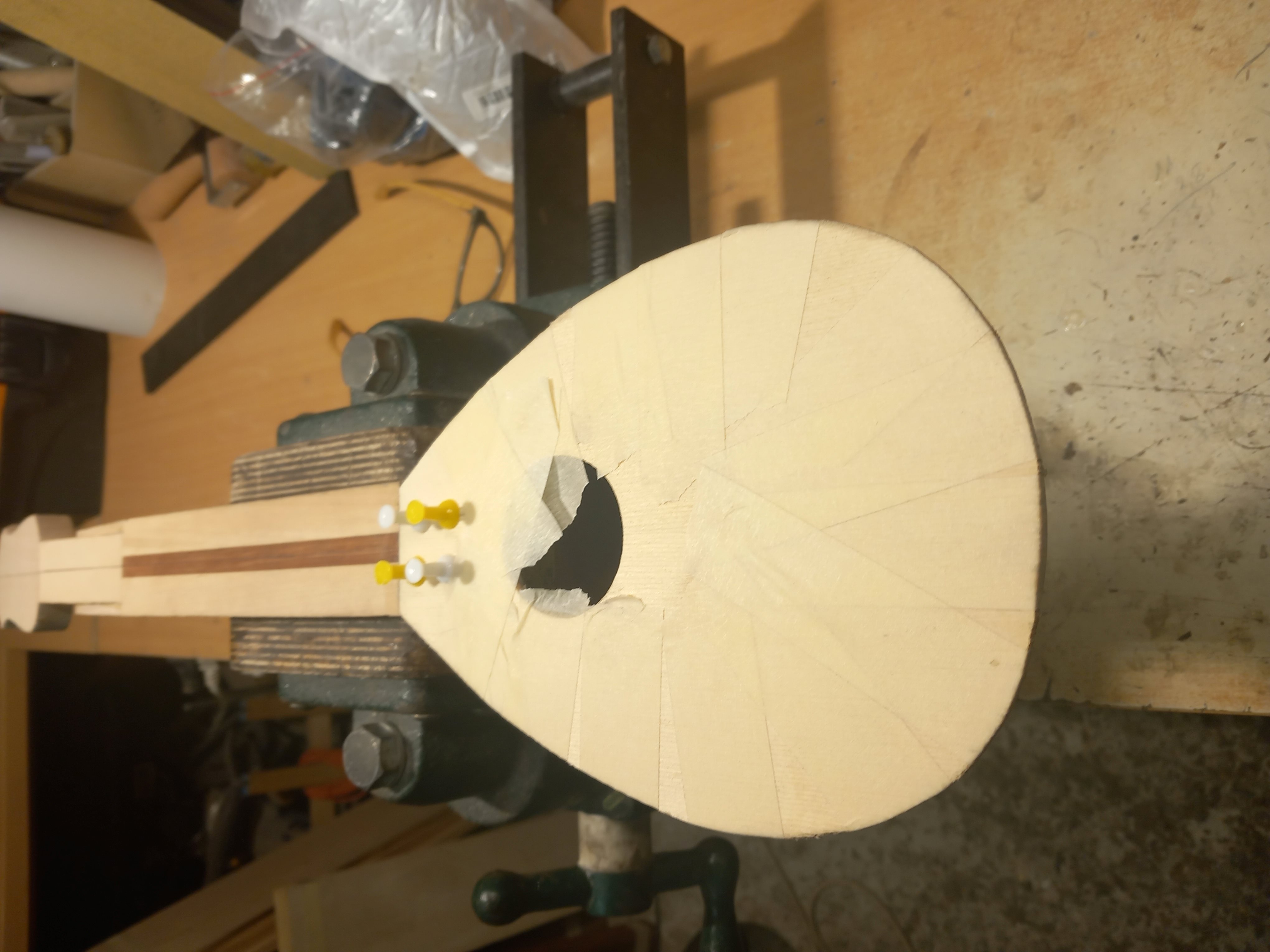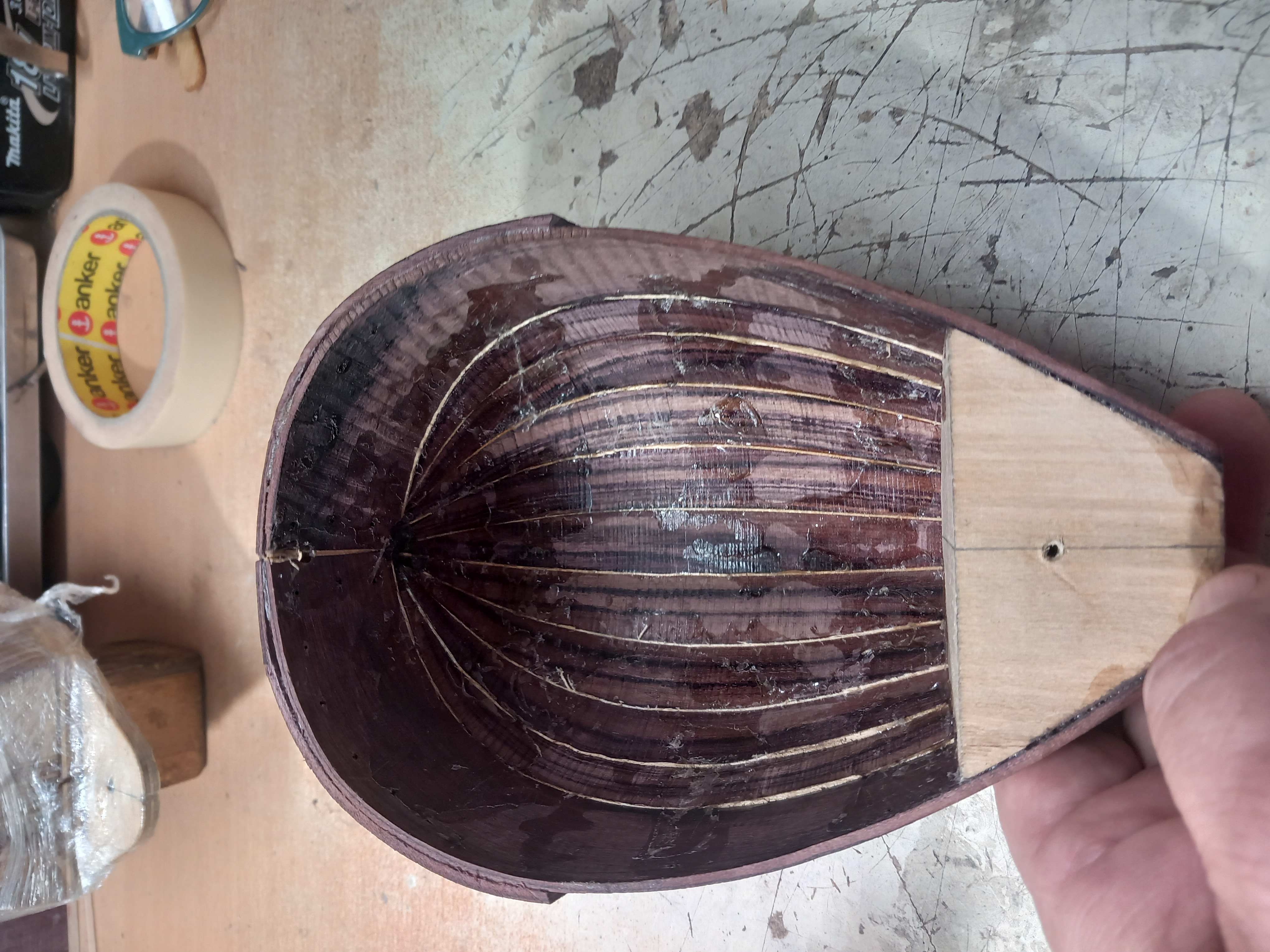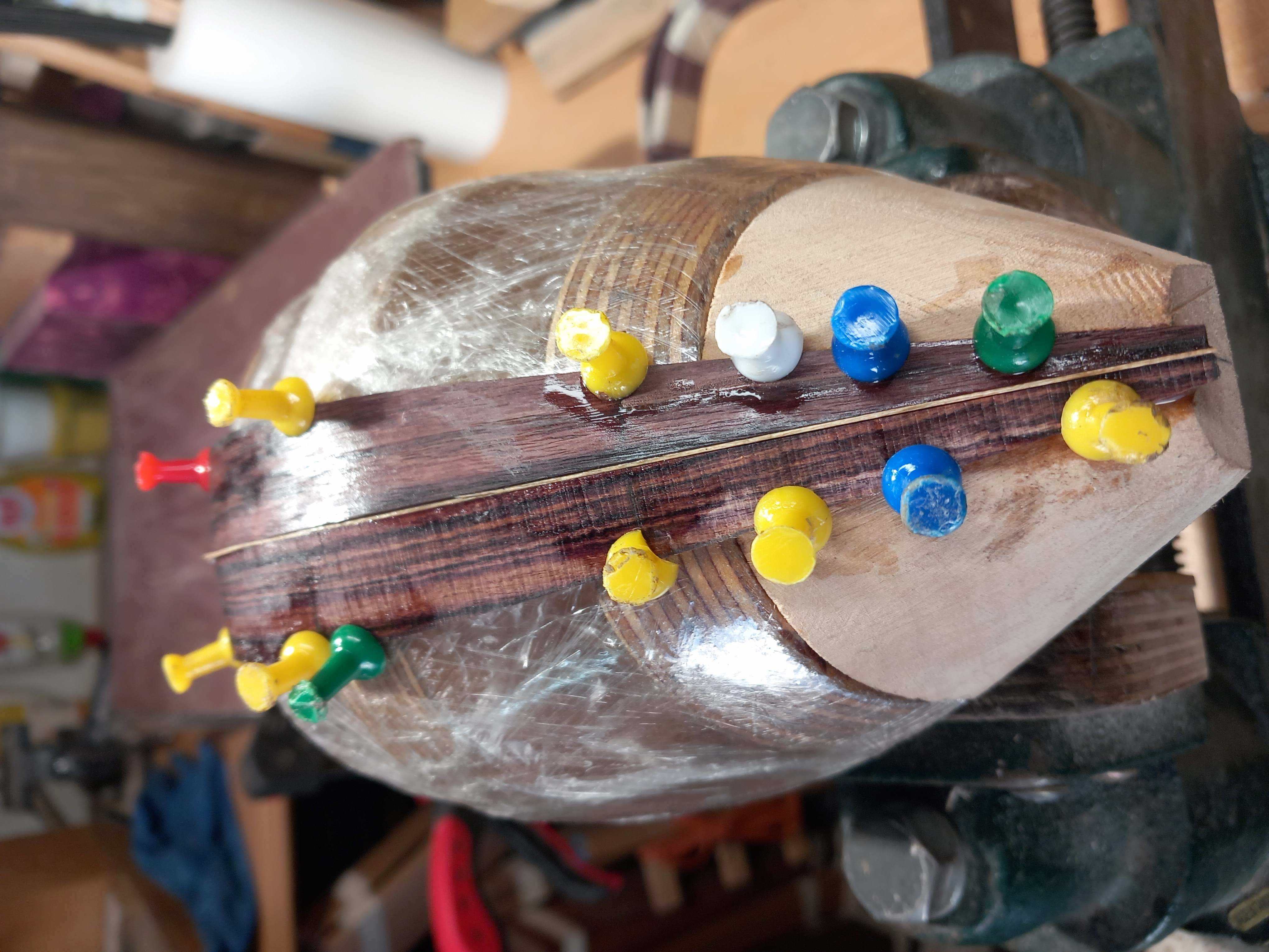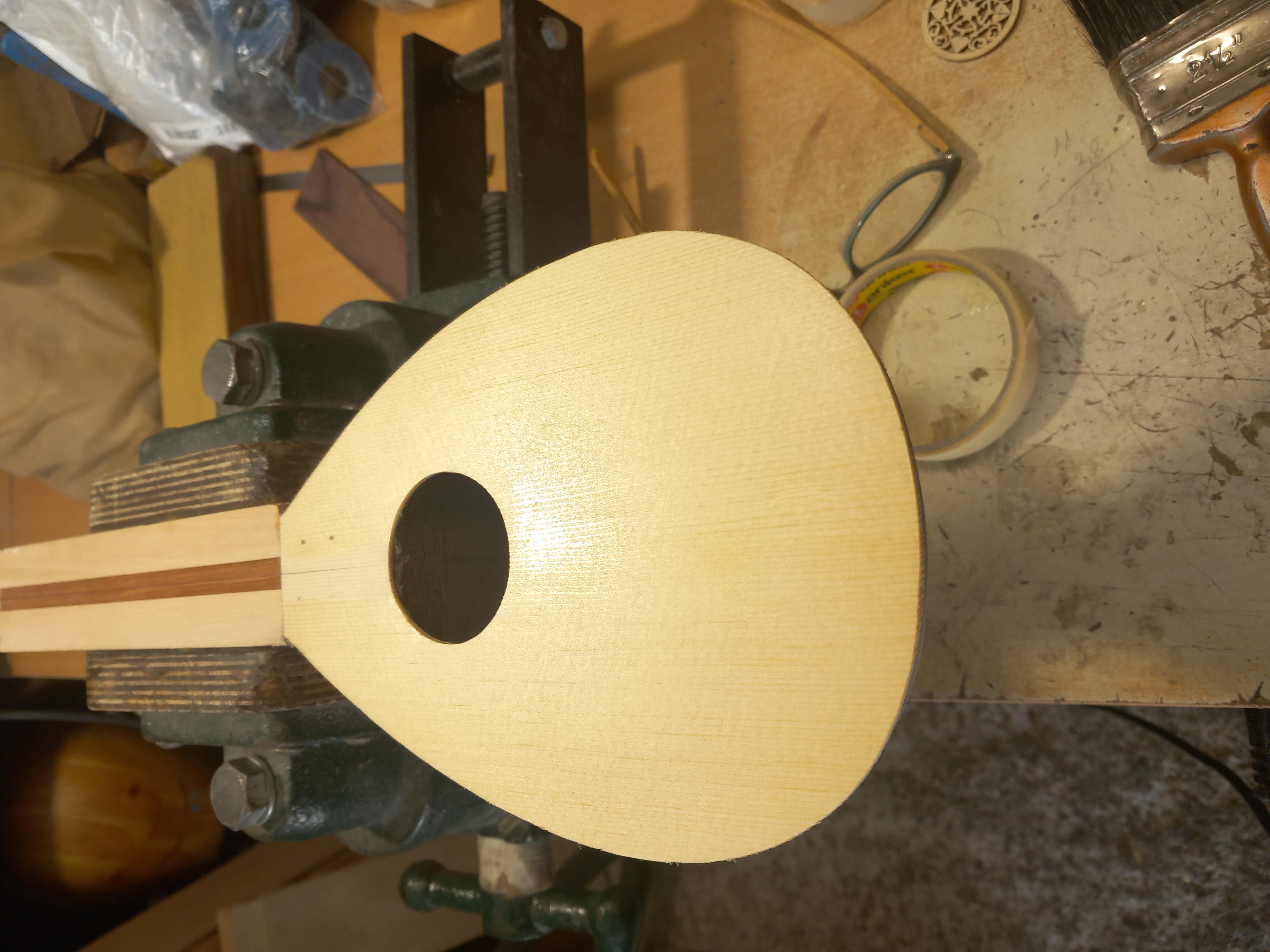 Συνέχεια με το μανίκι του μπαγλαμά . Δύο κομμάτια φλαμούρι και μια κόντρα από μαόνι στη μέση κολλημένα με ψαρόκολλα. Το καράολο και αυτό από φλαμούρι. Η γωνία κλίσης στο καράολο είναι 10 μοίρες.  Το καπάκι είναι από περισσεύματα από καπάκια μπουζουκιών. Δεν είναι μονοκόμματο. Είναι δύο κομμάτια ενωμένα. Ανοίχτηκε η τρύπα και μπήκε ένα καμάρι. Η διάμετρος της τρύπας είναι 42 mm. Χαράχτηκε και η ταστιέρα με μήκος χορδής 38. Περιμετρικά του σκάφους κόλλησα μια λωρίδα χαρτί να συγκρατήσει όσο γίνεται την ψαρόκολλα όταν κολληθεί το καπάκι για να μειώσω τα τρεξίματα της κόλλας μέσα στο σκάφος.