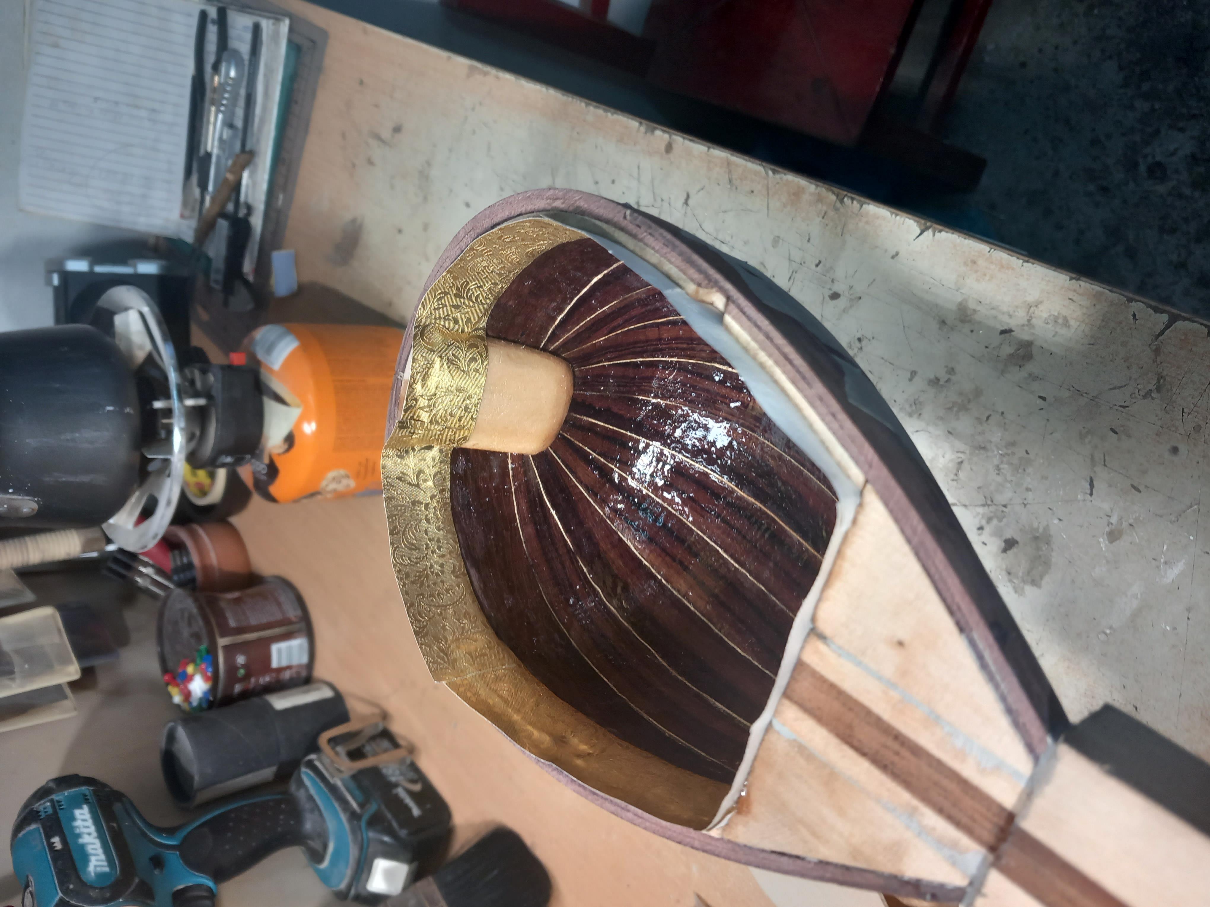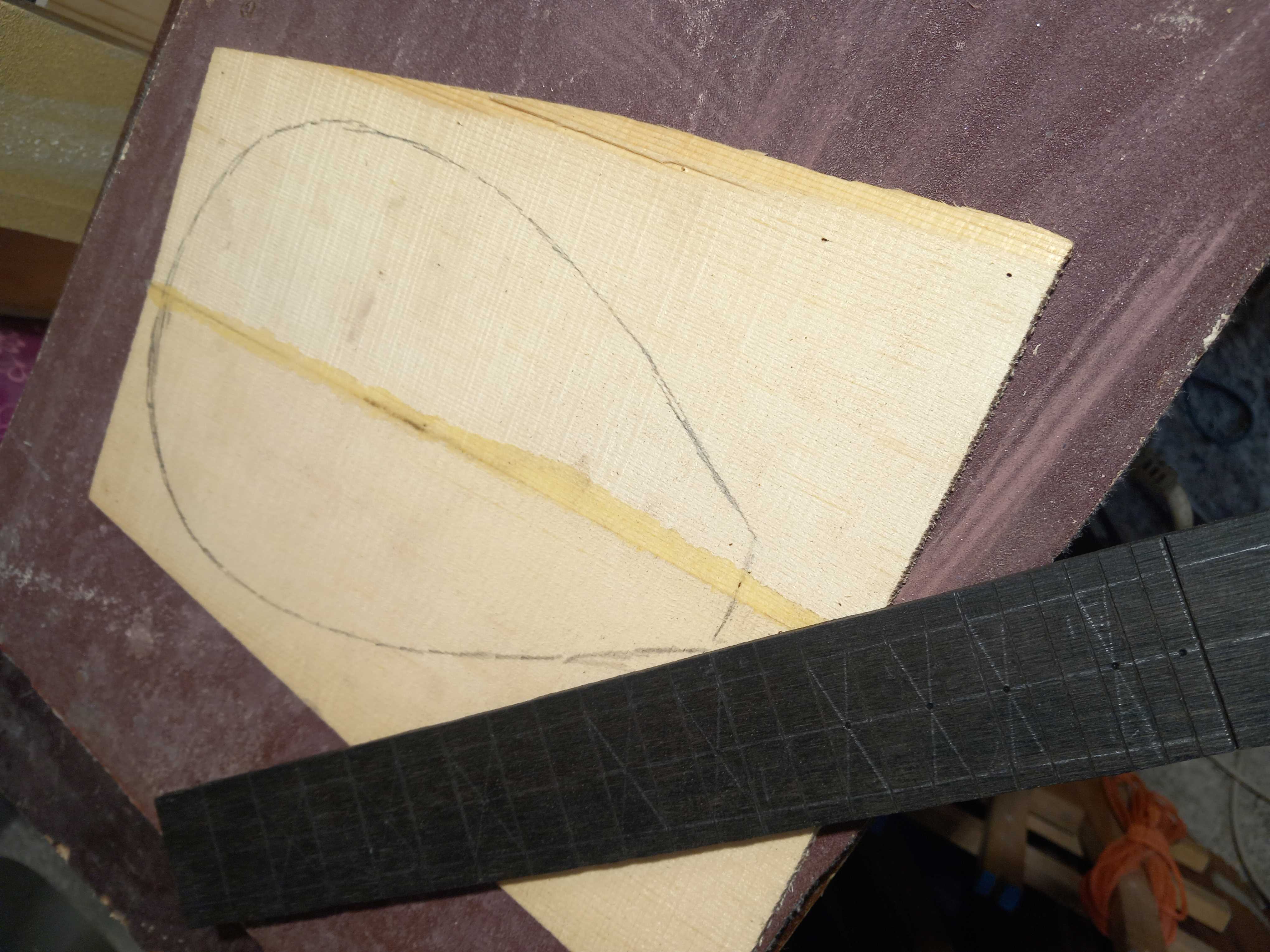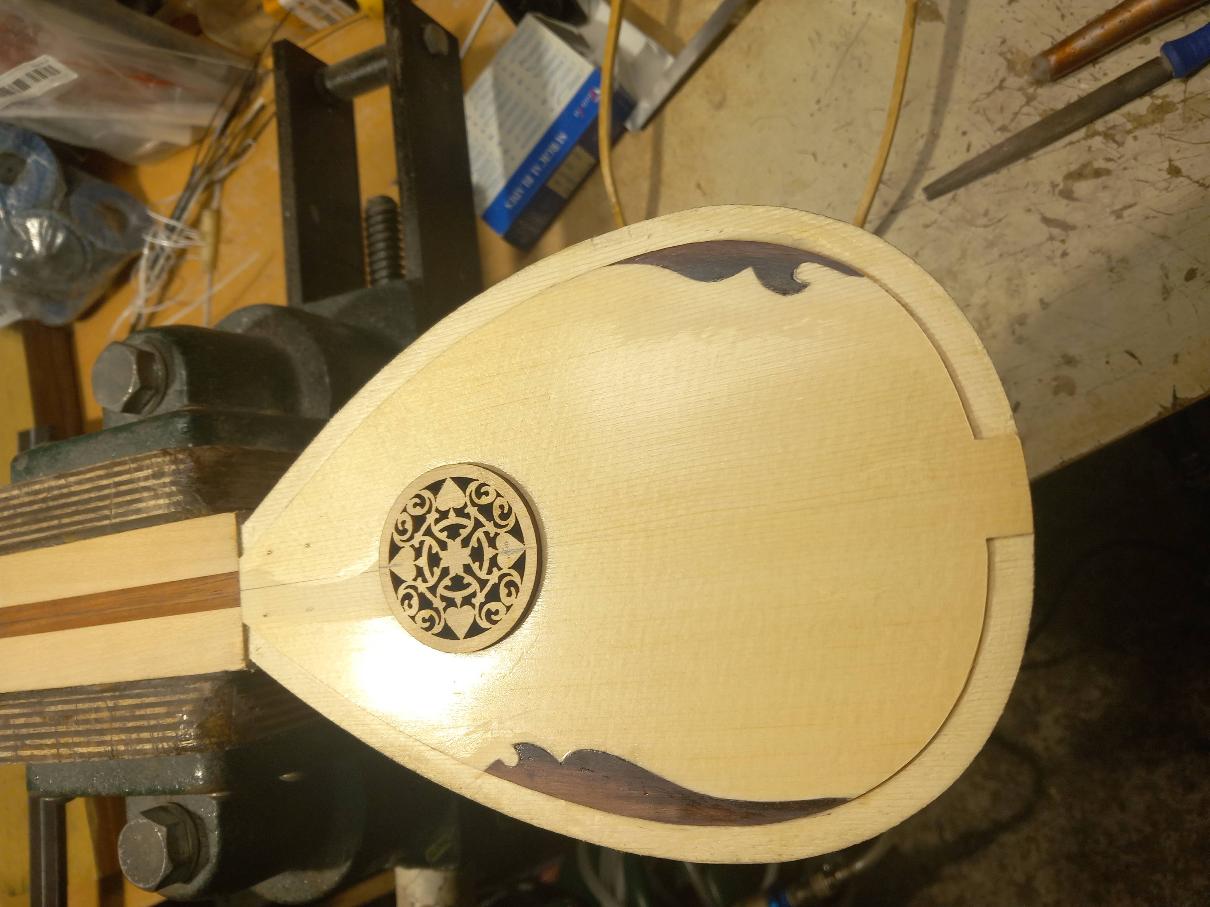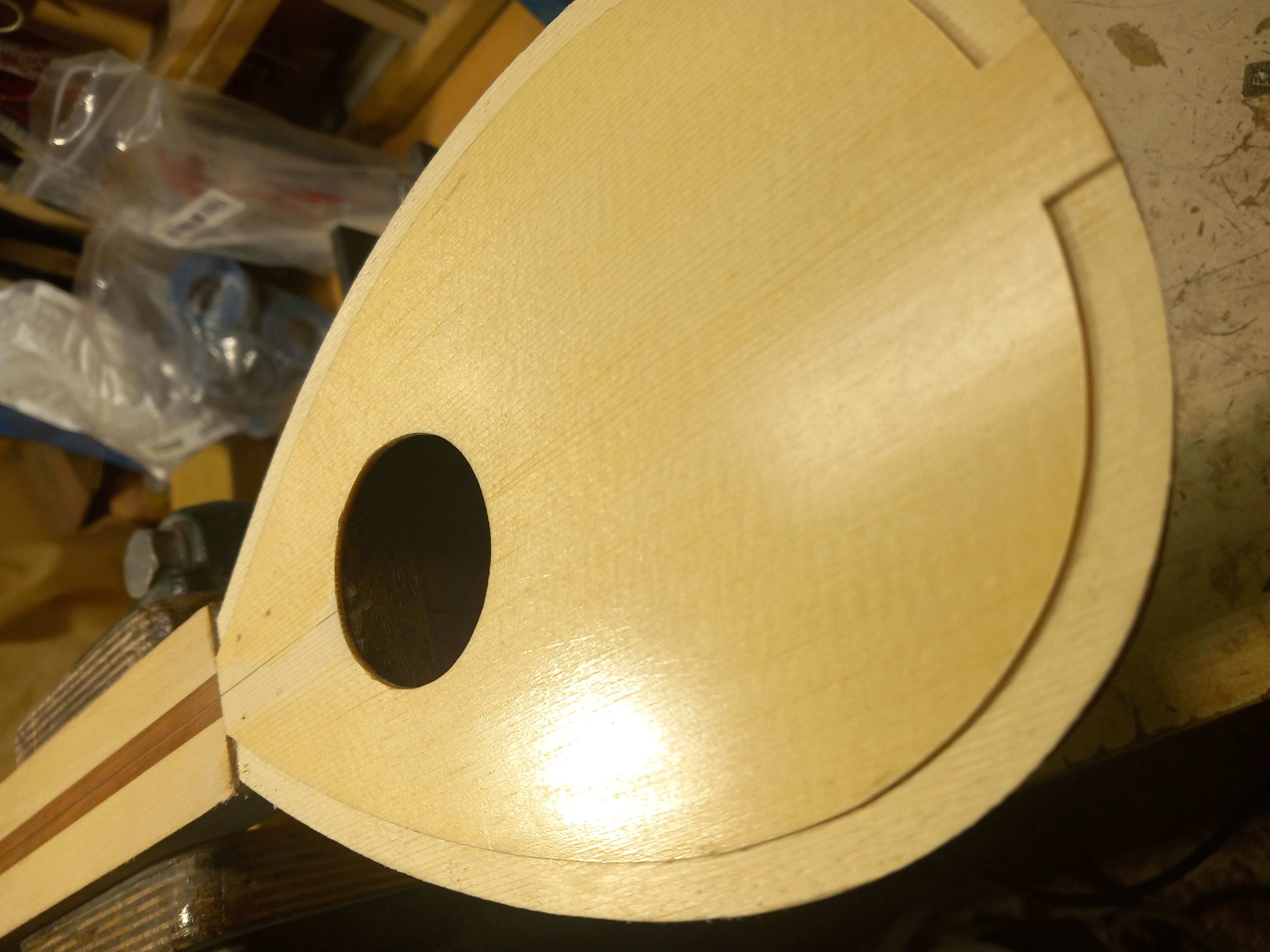 Συνέχεια με το μανίκι του μπαγλαμά . Δύο κομμάτια φλαμούρι και μια κόντρα από μαόνι στη μέση κολλημένα με ψαρόκολλα. Το καράολο και αυτό από φλαμούρι. Η γωνία κλίσης στο καράολο είναι 10 μοίρες.  Το καπάκι είναι από περισσεύματα από καπάκια μπουζουκιών. Δεν είναι μονοκόμματο. Είναι δύο κομμάτια ενωμένα. Ανοίχτηκε η τρύπα και μπήκε ένα καμάρι. Η διάμετρος της τρύπας είναι 42 mm. Χαράχτηκε και η ταστιέρα με μήκος χορδής 38. Περιμετρικά του σκάφους κόλλησα μια λωρίδα χαρτί να συγκρατήσει όσο γίνεται την ψαρόκολλα όταν κολληθεί το καπάκι για να μειώσω τα τρεξίματα της κόλλας μέσα στο σκάφος.