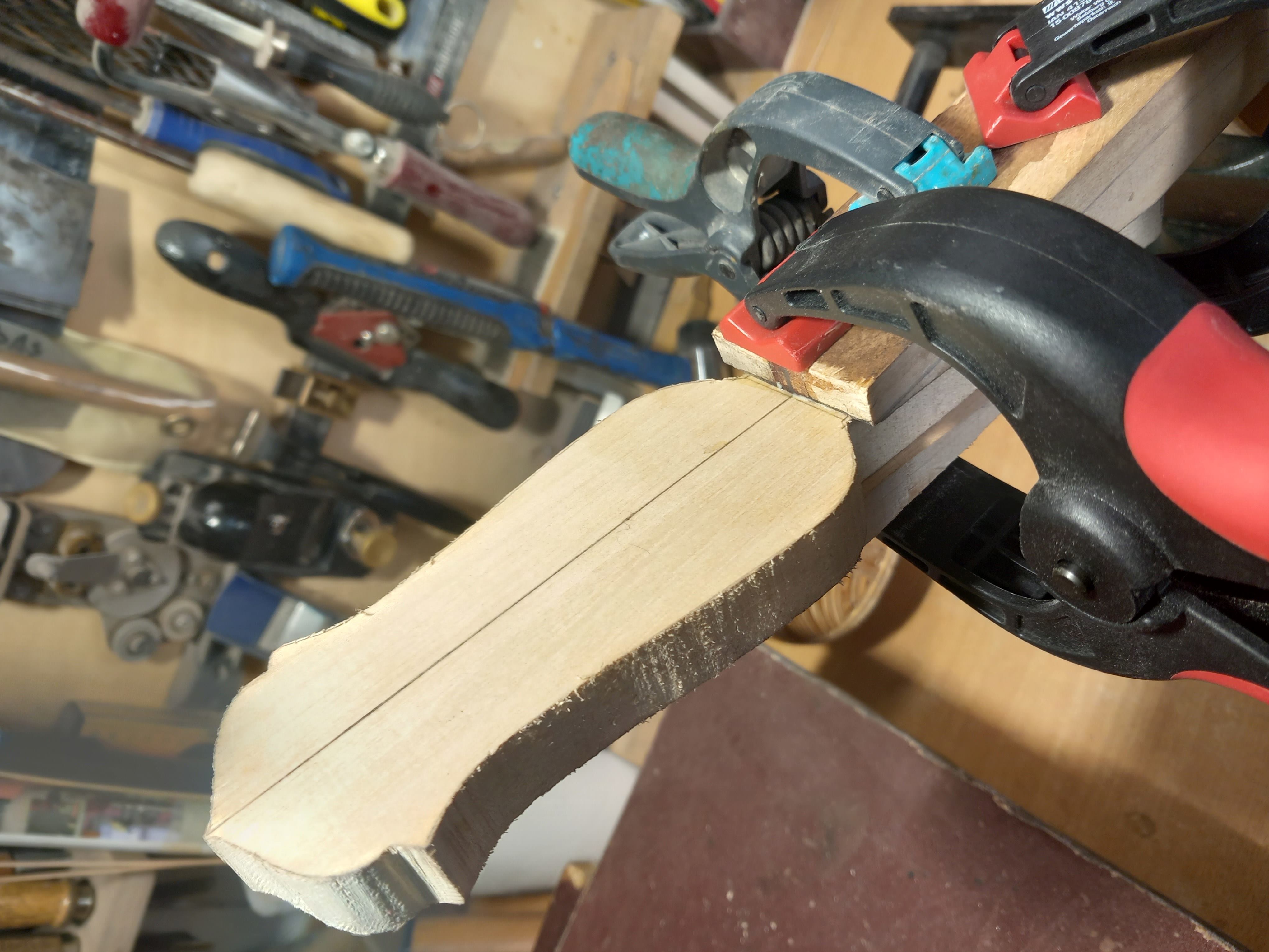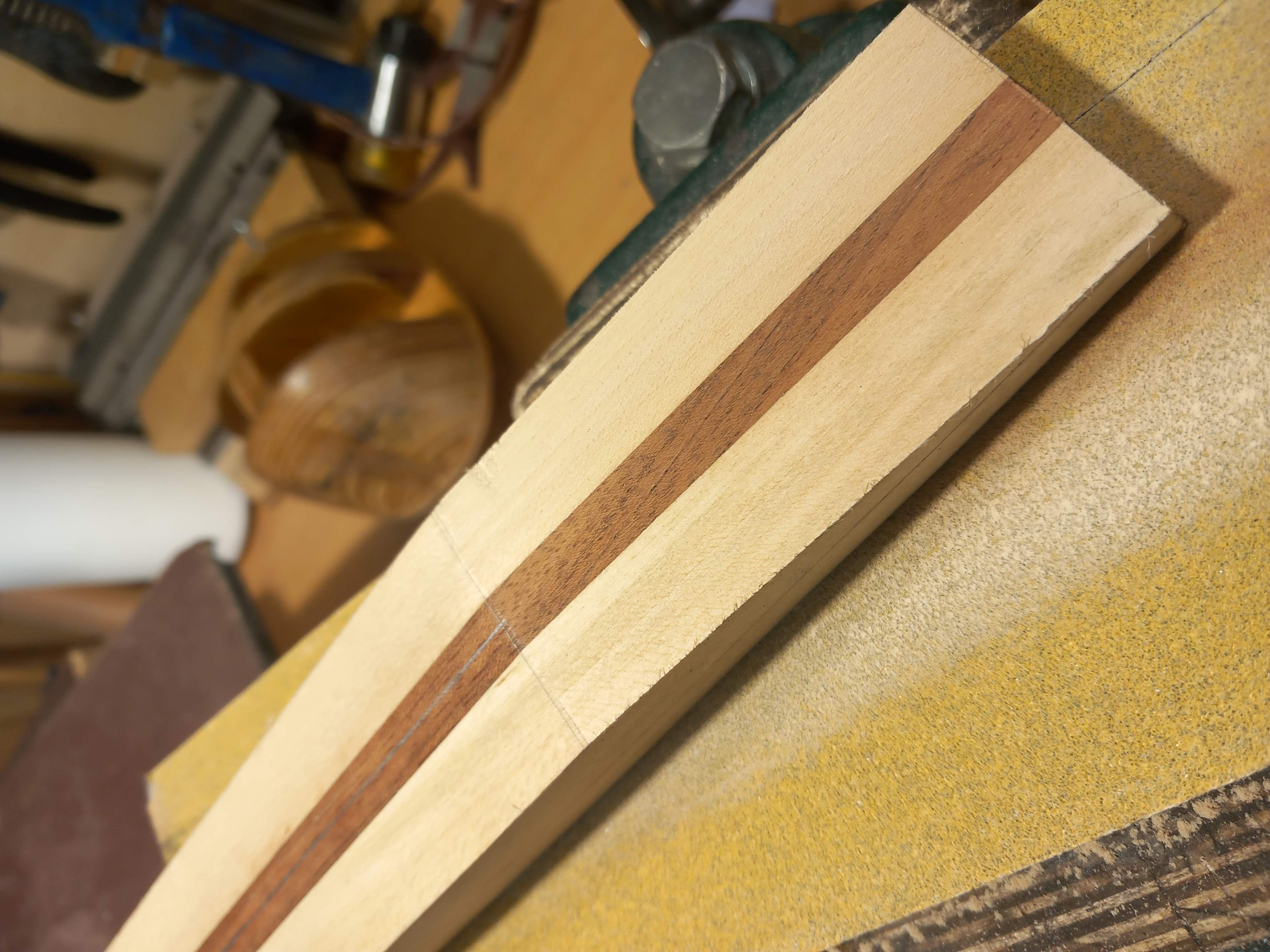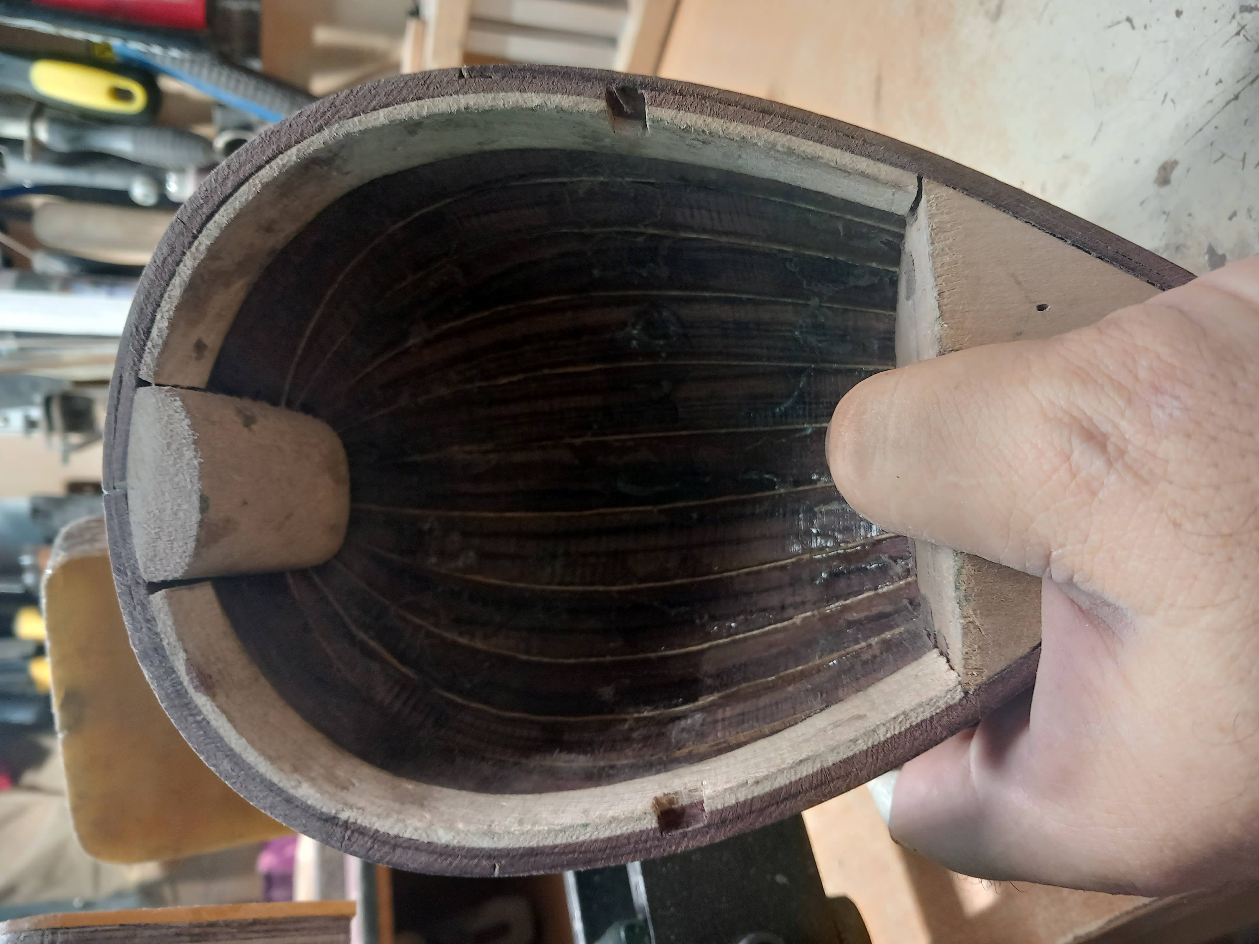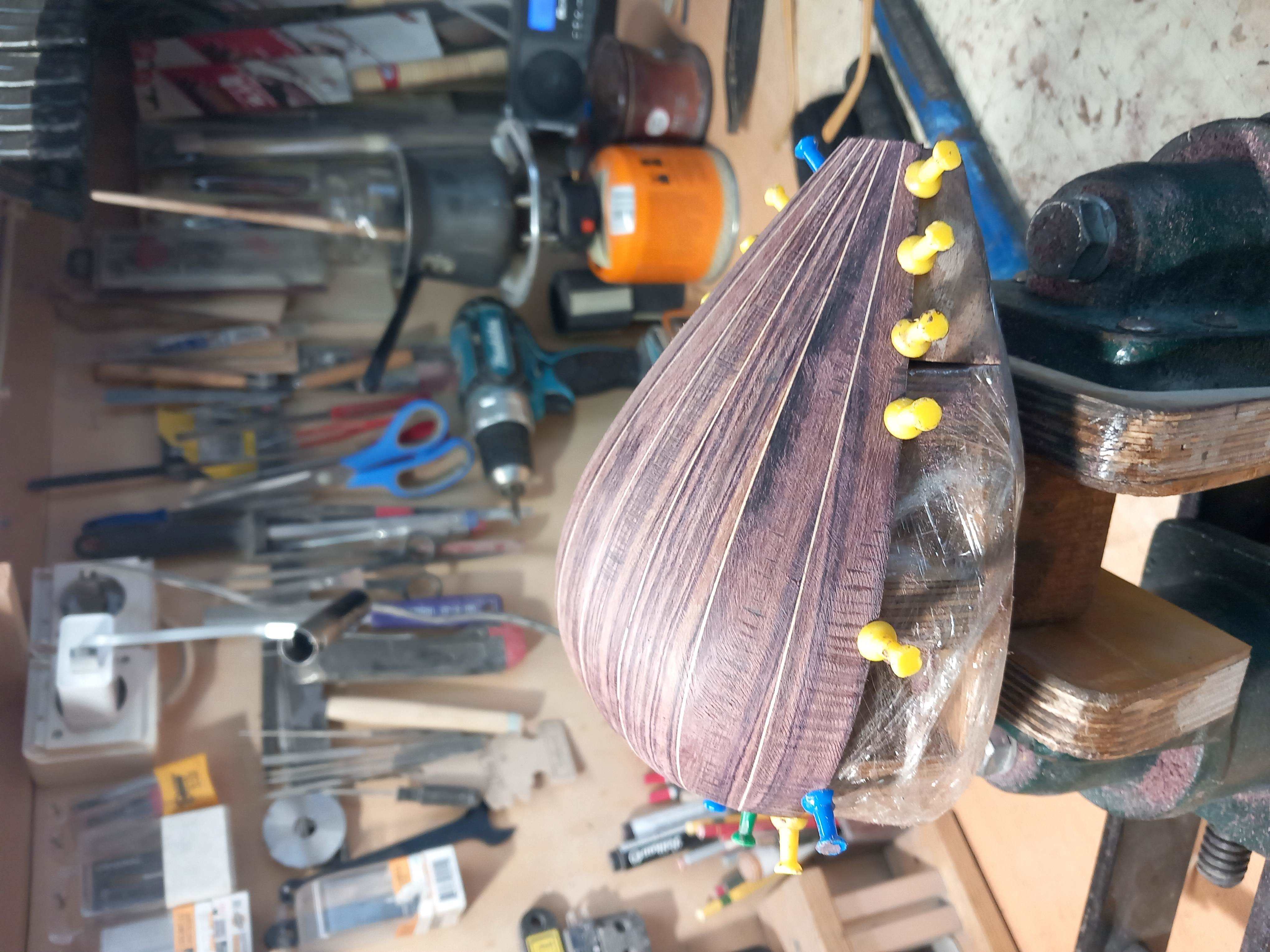 Συνέχεια με το μανίκι του μπαγλαμά . Δύο κομμάτια φλαμούρι και μια κόντρα από μαόνι στη μέση κολλημένα με ψαρόκολλα. Το καράολο και αυτό από φλαμούρι. Η γωνία κλίσης στο καράολο είναι 10 μοίρες.  Το καπάκι είναι από περισσεύματα από καπάκια μπουζουκιών. Δεν είναι μονοκόμματο. Είναι δύο κομμάτια ενωμένα. Ανοίχτηκε η τρύπα και μπήκε ένα καμάρι. Η διάμετρος της τρύπας είναι 42 mm. Χαράχτηκε και η ταστιέρα με μήκος χορδής 38. Περιμετρικά του σκάφους κόλλησα μια λωρίδα χαρτί να συγκρατήσει όσο γίνεται την ψαρόκολλα όταν κολληθεί το καπάκι για να μειώσω τα τρεξίματα της κόλλας μέσα στο σκάφος.