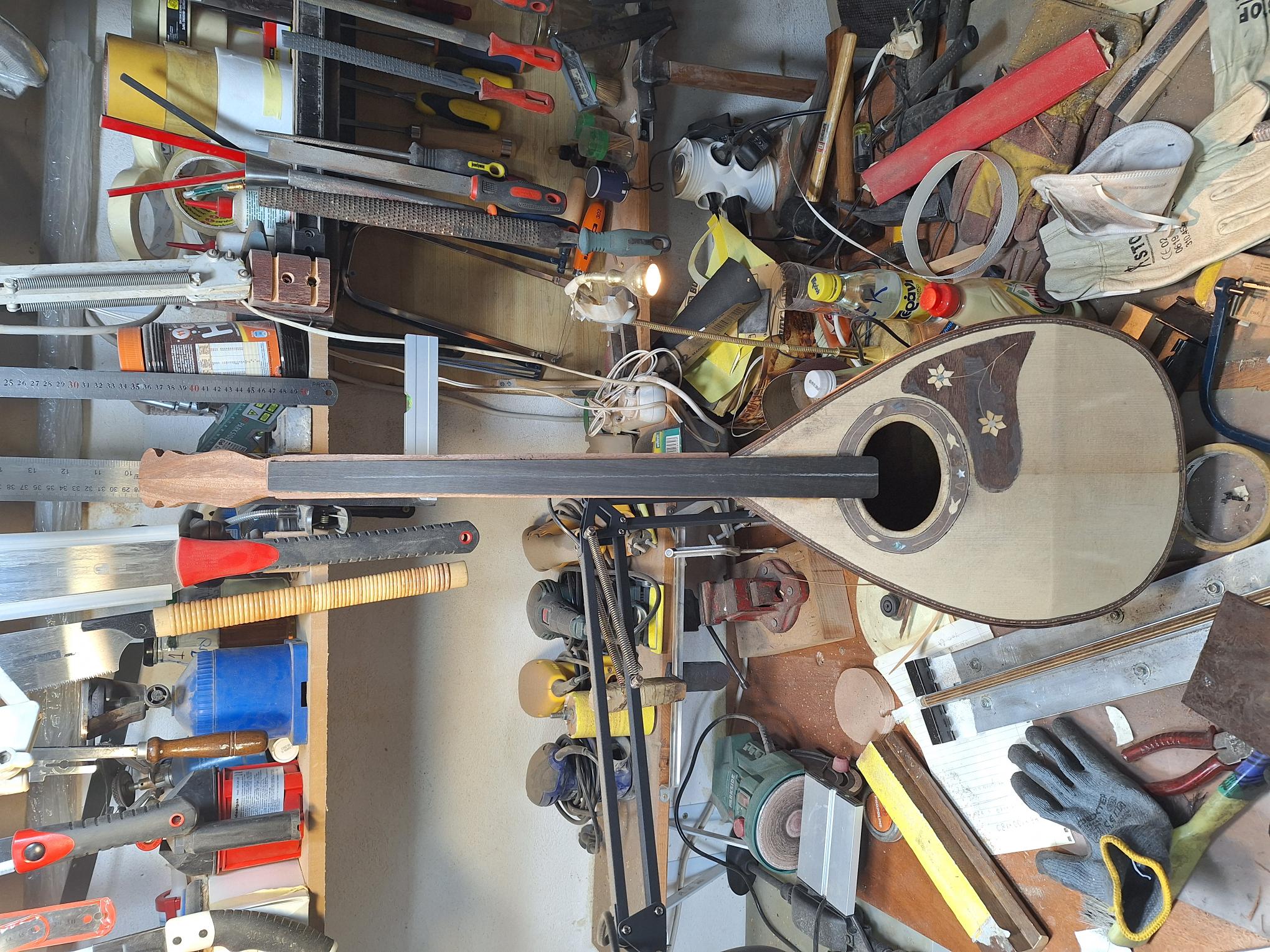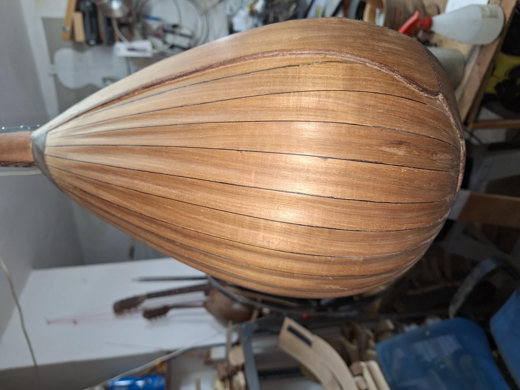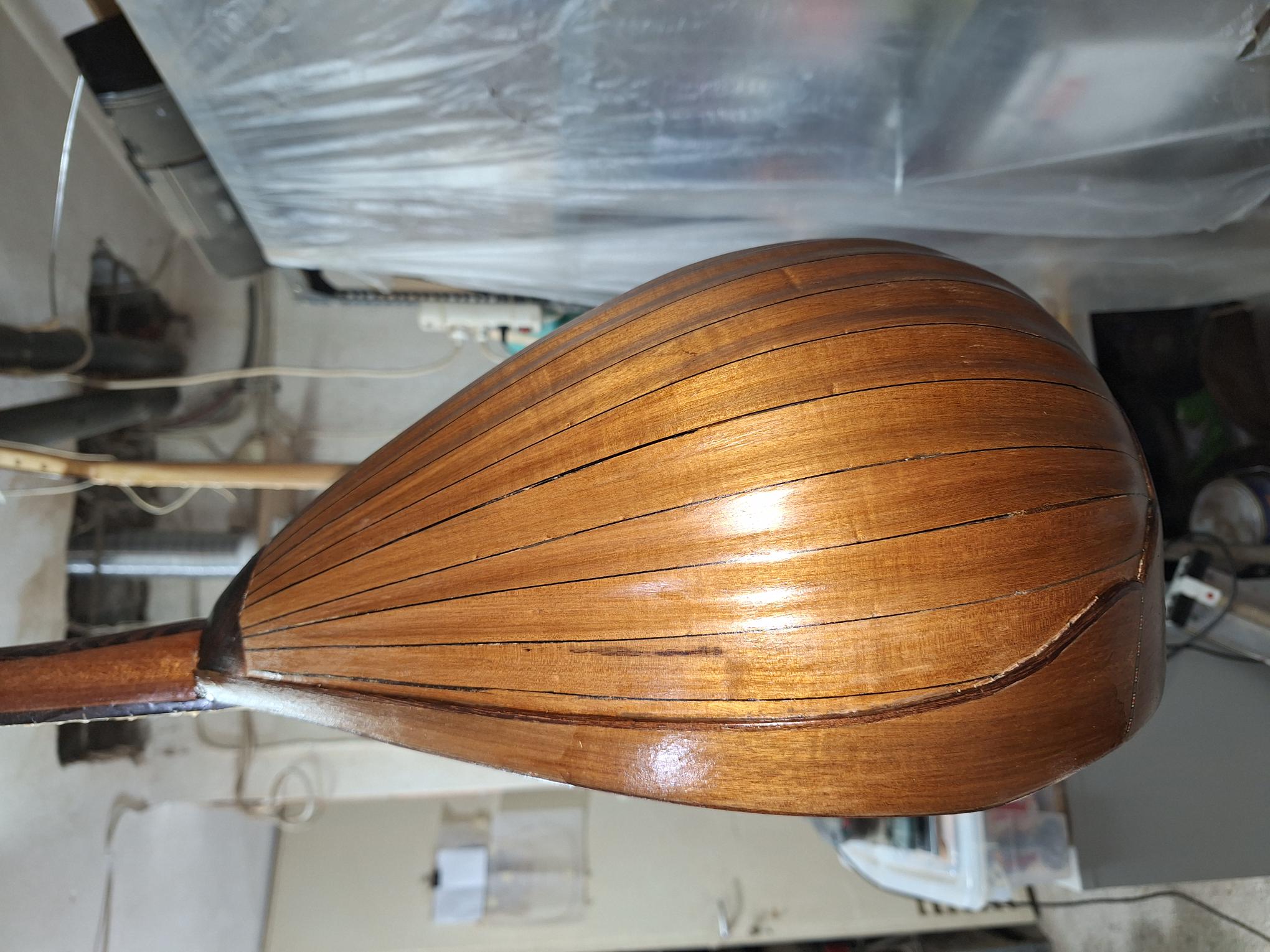 Όλο το όργανο περάστηκε με γυαλόχαρτα 60-100-120-180-240-320-400. Μ/εχρι και το 120 με το παλμικό τριβείο εκτός του σκάφους καθότι οι ντούγες είναι σκαφτές. Όλη η δουλειά με το χέρι. Πονέσαν τα δάχτυλα μου. Τα σκάφη με ανάγλυφες σκαφτές ντούγες είναι πολύ όμορφα αλλά η δουλειά έχει πολύ παίδεμα. Νομίζεις ότι τελειώνεις με το ένα γυαλόχαρτο αλλά άμα το δεις προσεκτικά θέλει ξαναπέρασμα και ξανά και ξανά...