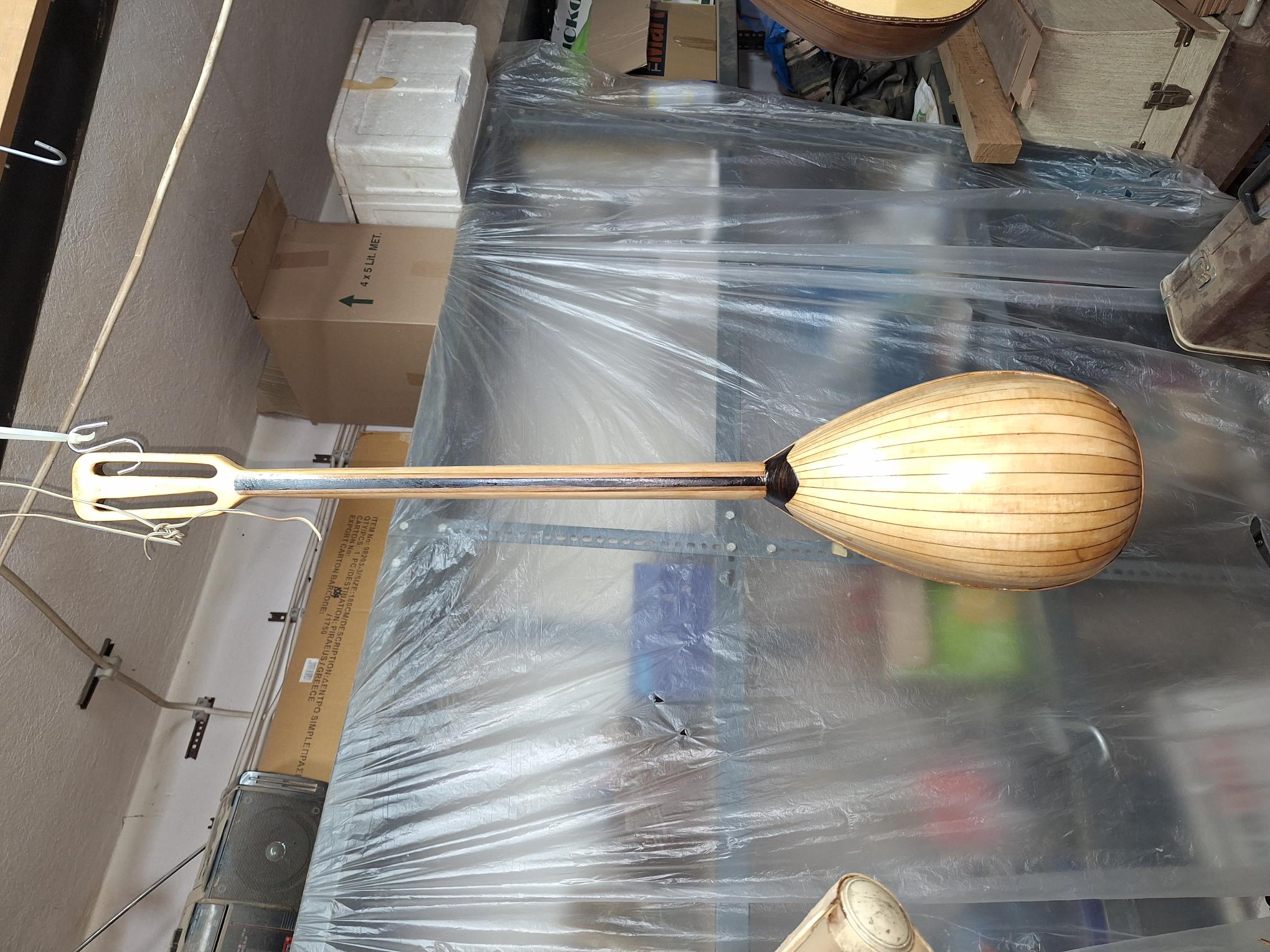 Και επιτέλους προχωράμε μετά από πολλά εμπόδια.Όπως είχα αναφέρει σε προηγούμενο ποστ (στα ημερολόγια) μετά την τελευταία αναφορά εδώ είχαμε ατύχημα. Το όργανο έπεσε από εκεί που το είχα κρεμασμένο. Σκίστηκε το καπάκι και ένα καμάρι. Κανονικά θα έπρεπε να καπάκι να ξεκολληθεί εντελώς και να γίνει με ευκολία και ακρίβεια η επισκευή και βασικά να αλλαχθεί το αρχικό καμάρι (ήταν της αρχικής κατασκευής. Στην προσπάθεια μου να το ξεκολλήσω, το καπάκι ξεκίνησε να παθαίνει ζημιά οπότε αποφάσισα να κανω την επισκευή χωρίς να ξεκολλήσω το καπάκι σε όλη την περιφέρεια αλλά περίπου στα 2/3. Κολλήθηκε το σχισμένο καμάρι, τα σχισίματα (μπήκε ενίσχυση με κομμάτακια έλατο από κάτω), και τα φιλέτα περιφερρειακά. Αφού λοιπόν αποκαταστάθηκε η ζημιά, προχωρήσα στο πέρασμα των τάστων και στην μορφοποίηση του μάνικου. Τώρα επόμενο βήμα το γενικό τρίψιμο και πάμε για λούστρα.