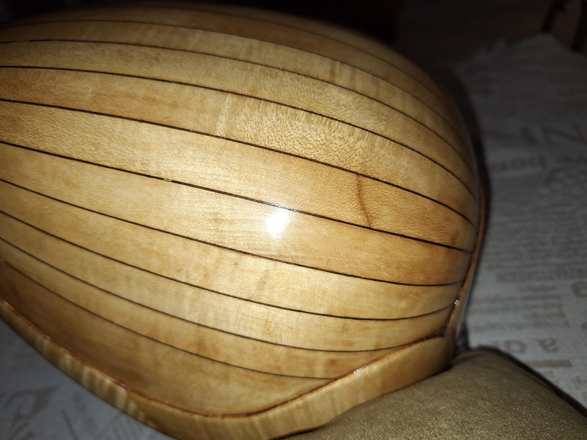 Παιδεύτηκα πολύ αλλά τελειώσα με τα τριψίματα. Το παλιό βερνίκι πε παίδεψε πολύ για να βγει. Σκληρό και με καλή πρόσφυση. Μιλάμε λογικά για βερνίκι νίτρου που σκουραίνει πολύ. Το σκάφος από κελεμπέκι μουαρέ που ήταν τελειώς μελί. Στα σημεία του μουαρέ δεν έβγαινε με τίποτα, άφηνε σκούρες γραμμές. Με πολύ κόπο αφαιραίθηκε. Το ενδιαφέρον είναι μια παρατήρηση που έκανα Το κελεμπέκι το παλιό (πάνω από 70 χρονών στην συγκεκριμένη περίπτωση) δεν κατεβαίνει σε πάχος με τίποτα. Πολύ σκληρό και το γυαλόχαρτο σε λίγο σταματάει να κόβει. Ίδια παρατήρηση έιχα κάνει για το πολύ παλιό κελεμπέκι (άνω των 90 ετών) σε επισκευή παλιάς κιθάρας.