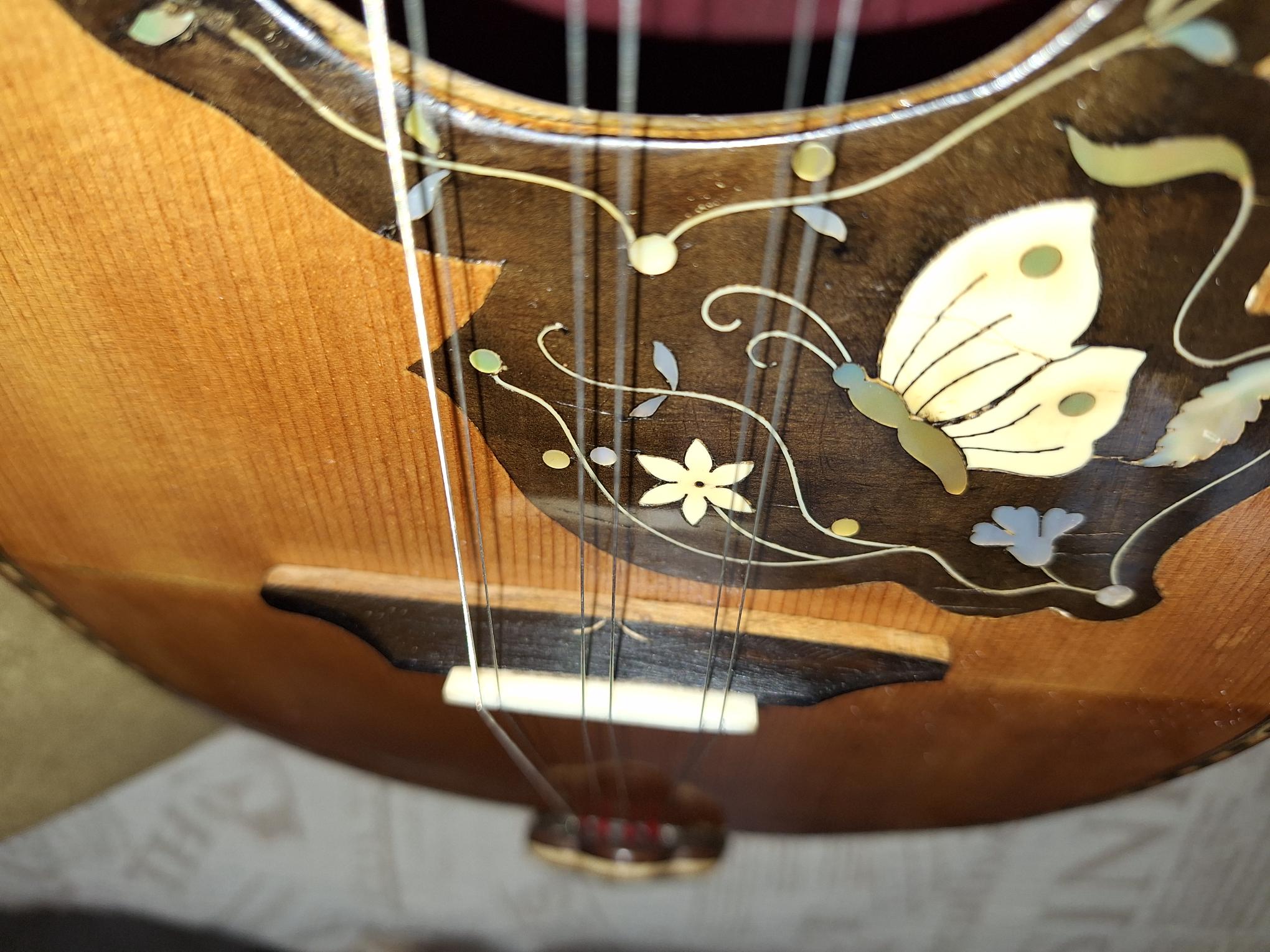 Καπάκι: Έλατο.Πεναριά και ροζέτα ενιαία. Όμορφη φιγούρα από όστρακο και κόκκαλο (του αρχικού κατασκευαστή). Τα λεπτά φιλέτα συνθετικά (σελουλόιντ). Κλασσικό καπάκι με τσάκιση. Περιμετρικά φιλέτα μαύρο/ασπρο/μαύρο/ασπρόμαυρο (έτοιμο)/μαόνι.