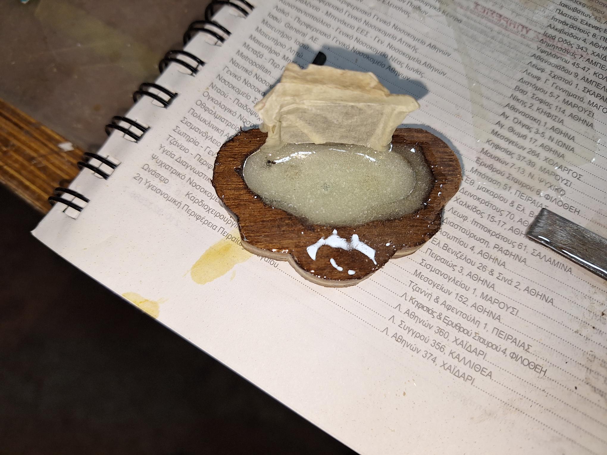 7) Χορδιέρα. Η αρχική μου σκέψη να κρατήσω την αυθεντική απορρίφηκε για πρακτικούς λόγους. Τη διάβρωση μποούσα να την καθαρίσω αλλά το πρόβλημα μου ήταν πως οι χορδιέρες μαντολίνου αφήνουν τη θηλειά των χορδών ακάλυπτη με συνέπια να σκαλώνει σε ρούχα στη θήκη οπότε απορρίφθηκε. Εβαλα μια χορδιέρα μπαγλαμά που της έκανα και μία επένδυση με ξύλο, αλλά τελικά δείχνει άσχημα. Θέλει μεγαλύτερη οπότε θα φτιάξω μία καινούργια πιο μεγάλη αυτήν την φορά.