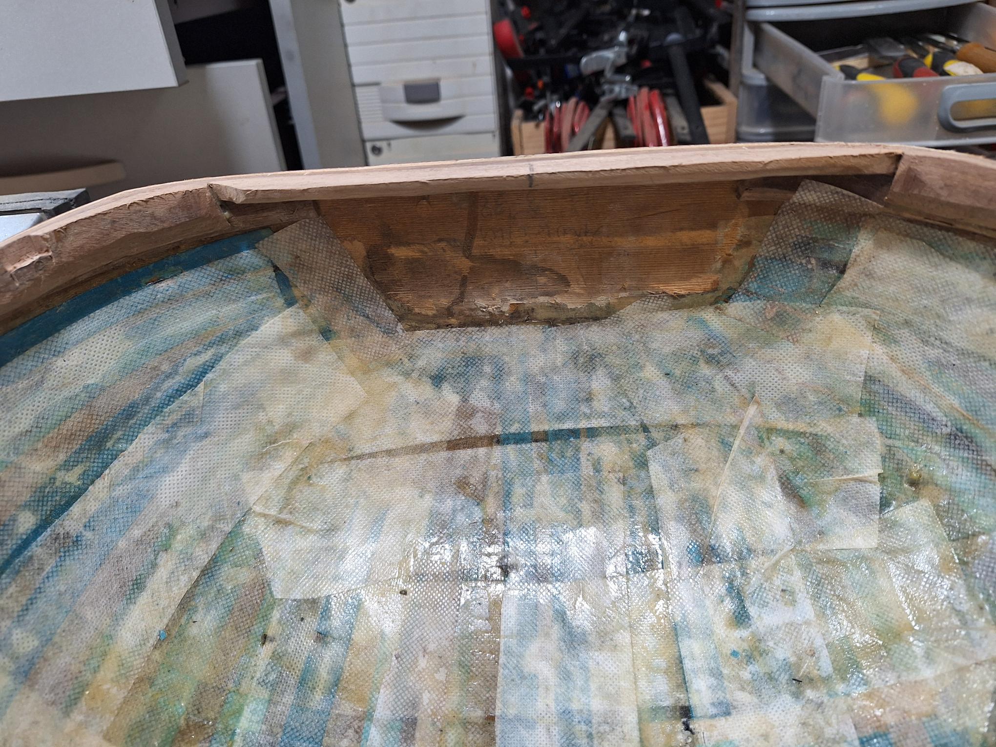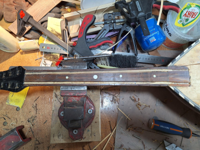 Ας γυρίσουμε στα κλειδιά. Δεν έχω ξαναδεί παρόμοια. Το βασικό στέλεχος των κλειδιών έχει σπειρώματα με δυο μικρά βιδάκια και σφίγγει πάνω στο μπρούτζινο καπάκι. Το καπάκι έχει πάχος κάποια δέκατα του χιλιοστού, και φέρει σκάλισμα. Το όλο σύστημα με 3 ξυλόβιδες σταθεροποιείται στο καράολο. Παρόλη την εντυπωσιακή εμφάνιση και λεπτομέρεια στην κατασκευή και διακόσμηση, δεν αποτελεί κατ' εμέ αξιόπιστη λύση. Εκτός από τις τρύπες στο ένα κλειδί που είχανε μεγαλώσει και έλειπε μέρος, είχε στραβώσει και το λεπτό καπάκι αλλά και το βασικό στέλεχος των κλειδιών. Η πρώτη αποκατάσταση ήταν το γέμισμα των τρυπών που είχανε ανοίξει με εποξική ρητίνη και ξανάνοιγμα νέων οπών σωστής πλέον διατομής αφού ισιώθηκαν όλα τα στραβωμένα μέρη. Το ταλαιπωρημένο καπάκι έπρεπε να ενισχυθεί. Προσάρμοσα λοιπον ενα λαμάκι αλουμινίου (πάχους 1.4 χιλιοστών) για να μπεί ανάμεσα στο καπάκι και στο στέλεχος του κλειδιού. Η όλη διαδικασία κρίνεται απαραίτητη γιατί δεν υπήρχε περίπτωση να αντέξει την τάση τεσσάρων χορδών. Ειδικά για το κλειδί που είχε γίνει η πατέντα με το σύρμα, αφού σφίχτηκε και σταθεροποιήθηκε όσον το δυνατόν καλύτερα, κολλήθηκε και με εποξική ρητίνη για επιπλέον σταθεροποίηση. Αφού όμως είχε και το σύρμα και την εποξική έπρεπε να κοπεί υποδοχή από το λαμάκι για να πατάει το κλειδί πάνω του.