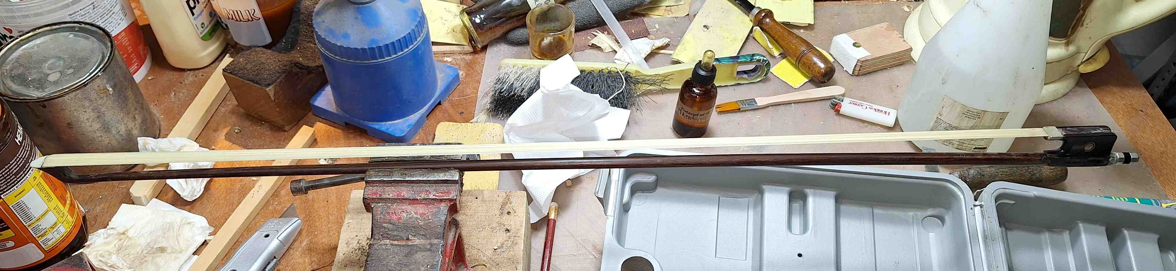 Τώρα στο δοξάρι έχει μία υποδοχή που κουμπώνει το κινητό μέρος (frog). Είχε σπάσει και το κρατούσε μόνο ένα δαχτυλίδι μεταλλικό που  είχε στην απόληξη του δοξαριού. Αφαιρέθηκε το δαχτυλίδι, κολλήθηκαν τα κομμάτια του ξύλου με εποξική κόλλα για να κλείσουν και καποια κενά που είχε. Ταυτόχρονα όμως έκλεισε και το κανάλι στο ξύλο του δοξαριού που πέρναγε τόσο η βίδα αλλά και το παξιμάδι του frog οπότε ξανανοίχθηκε σωστά. Επειδή το σημείο αυτό δέχεται μεγάλες πιέσεις ενισχύθηκε εξωτερικά με ένα φύλλο καπλαμά μαύρου στην περιοχή αυτήν. Τέλος περάστηκε ένα χέρι λούστρο όλο το δοξάρι.  Στο τέλος πέρασα και καινούργιες τρίχες στο δοξάρι γιατί οι υπάρχουσες είχαν τσουρομαδήσει. Ακόμα και το πέρασμα της τρίχας έχει αρκετή διαδικασία και χάρηκα που έμαθα και κάτι κανούργιο. Πάντως ότι θα χτένιζα τρίχες αλόγου δεν το περίμενα (όποιος ξέρει καταλαβαίνει).