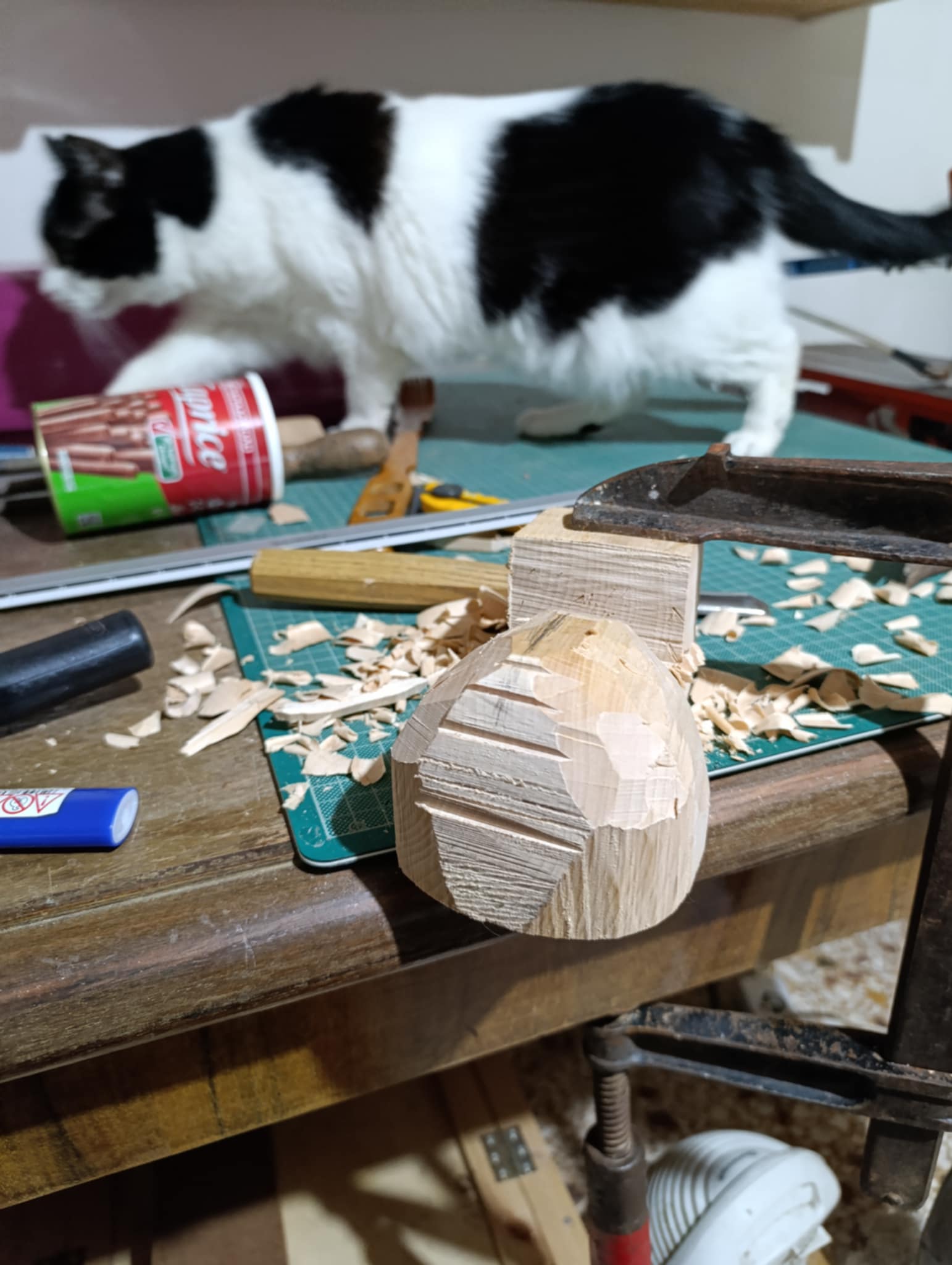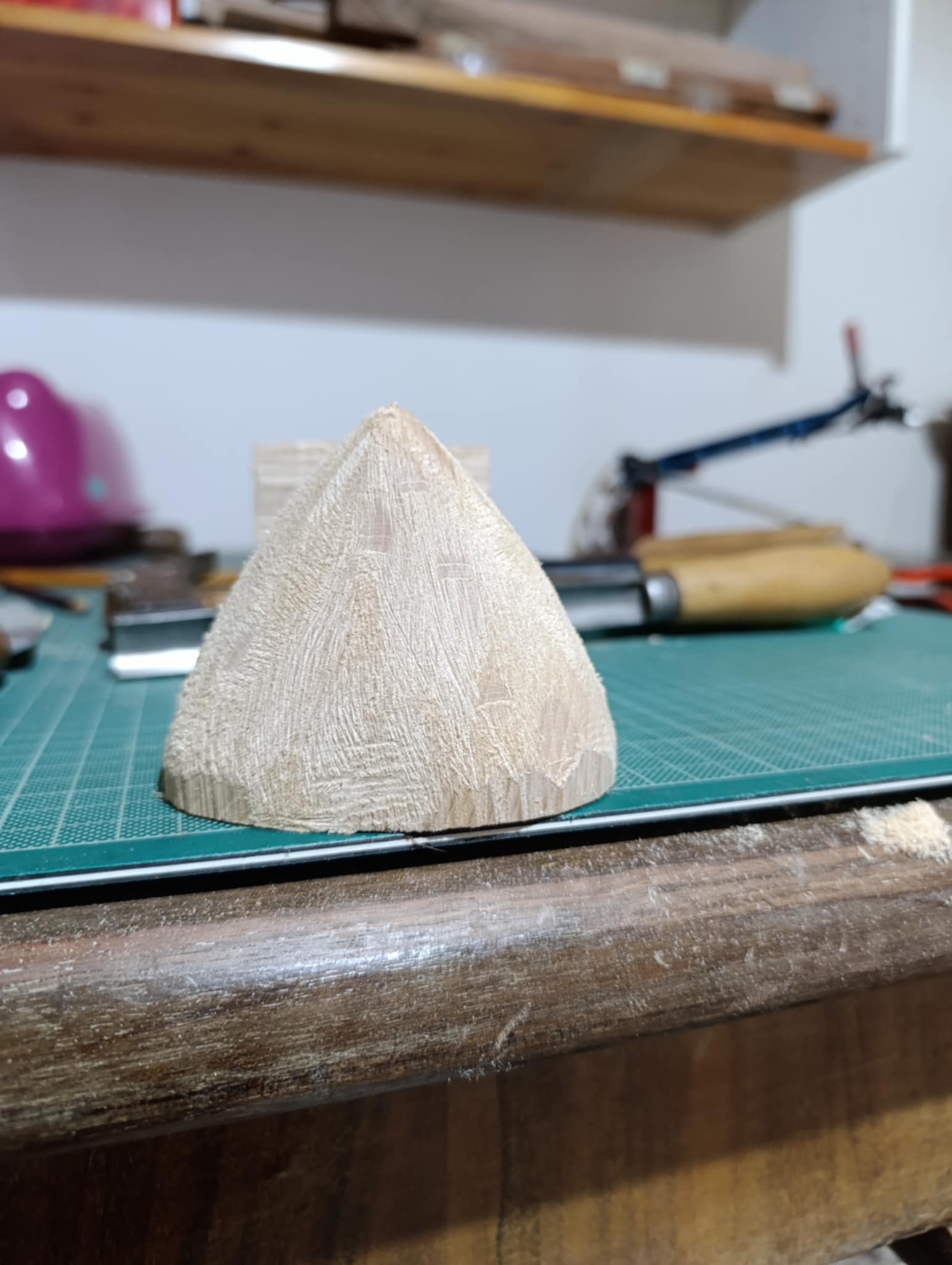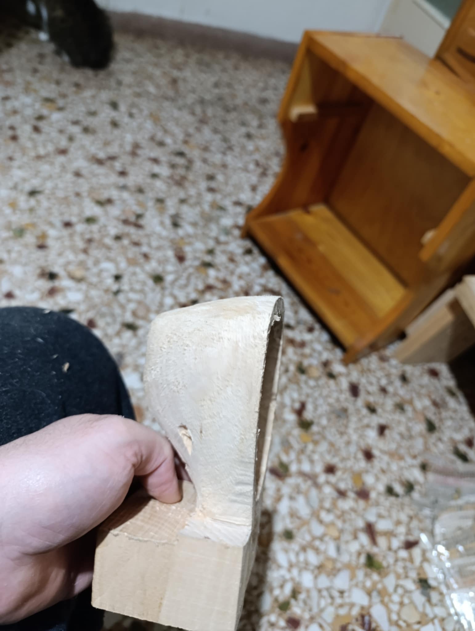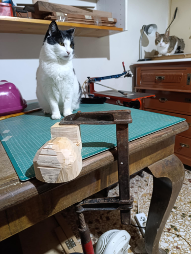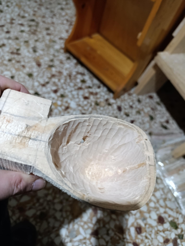 Στέλιο επειδή είναι φλαμούρι είναι σχετικά εύκολο να δουλευτεί, αν ήταν καρυδιά ή μουριά πιο δύσκολο σίγουρα, χρειάζονται δυο-τρία σκαρπέλα ελβετικά καλά ακονισμένα, δυο ράσπες η μία μισοστρόγγυλη και πριν ξεκινήσεις να έχεις φάει φασουλάδα με κρεμμύδι στουμπηχτό. Α! και ένα τρυπάνι ότι υπάρχει εύκαιρο, γιατί αλλιώς τι σόι τρυποκάρυδοι θα ήμασταν. μου βγήκε πιο κωνικό από όσο το ήθελα, δεν πειράζει στο δεύτερο θα το πετύχω, επίσης το ξετρύπησα καθώς το τρύπαγα, Νο προμπλέμο όμως, θα γίνει γιούφ η τρύπα.