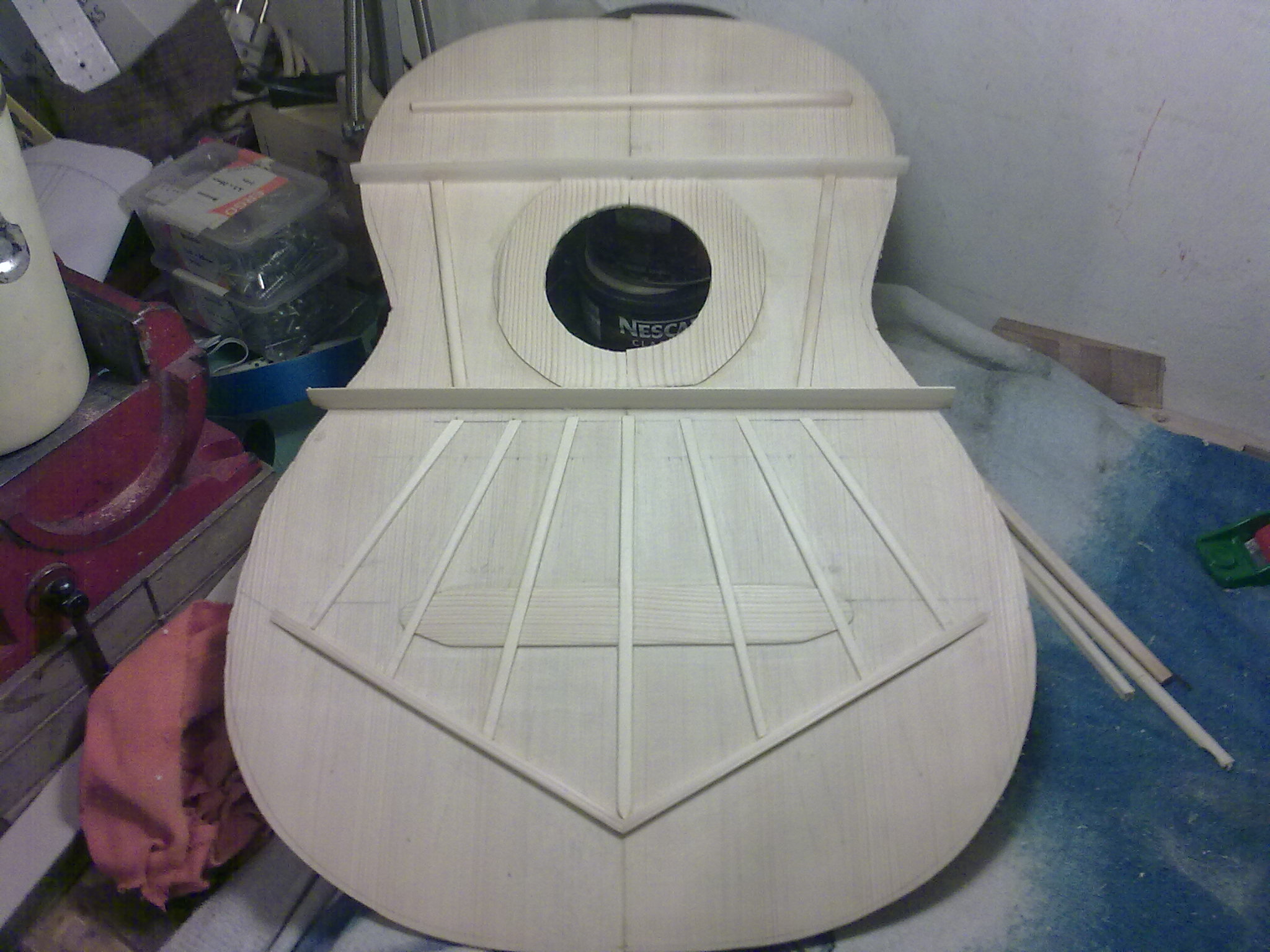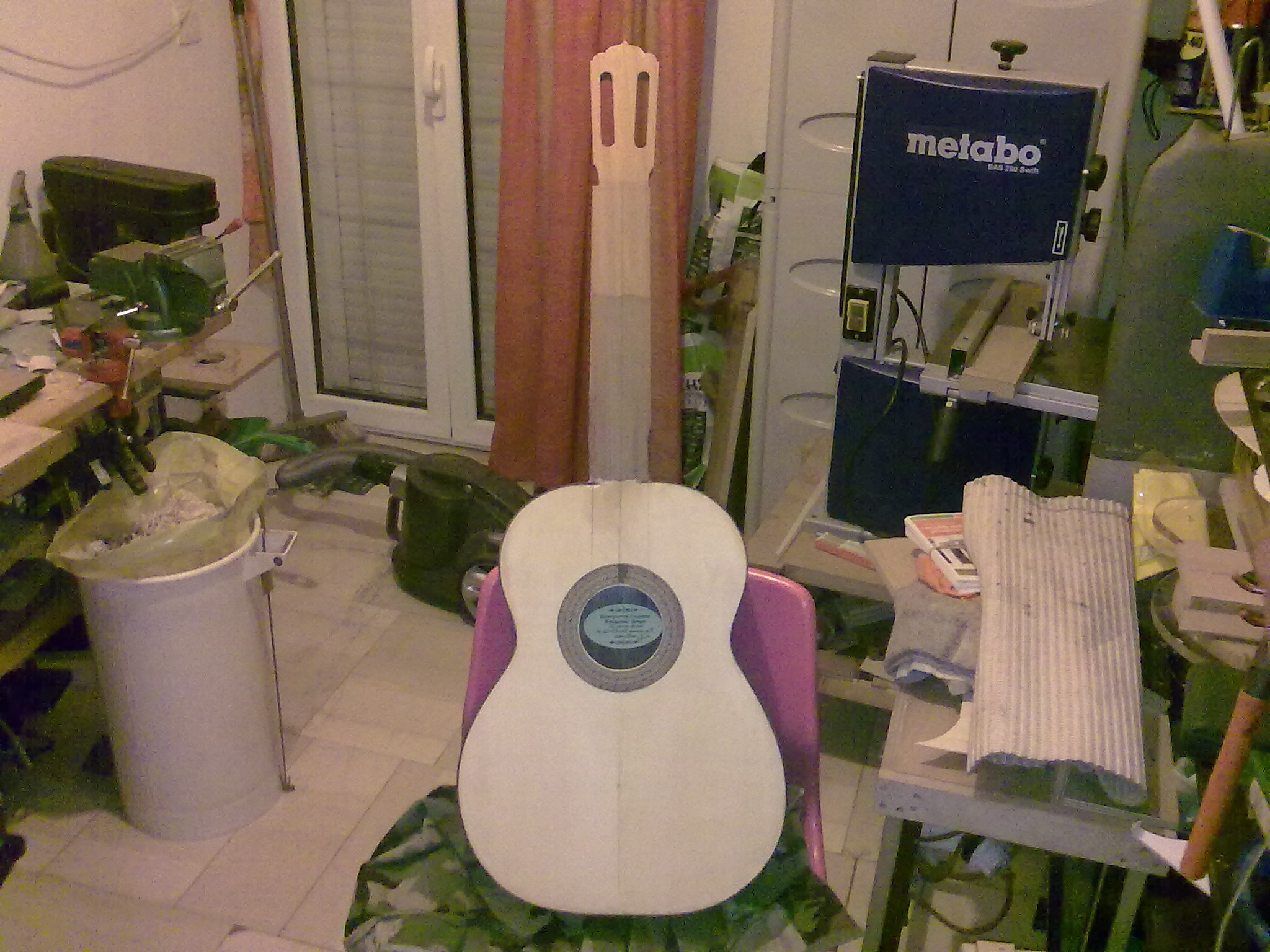 Δεν πρεπει να εχω φωτογραφιες απο το πλαϊνο,αλλα εχω κατα την κατασκευη της κιθαρας μεχρι εκεινο το σημειο που επαθα την ζημια. Επιχειρησα να αλλαξω το πλαϊνο και τα καταφερα,(Η διαδικασια γνωστη,θερμος αερας , υγρασια και πολυ υπομονη....) αλλα οι κλισεις ειχαν αλλαξει,και τοτε........Τοτε ημουν πολυ θυμωμενος και ξεκινησα αλλη κιθαρα και αυτην εδω την παρατησα στο υπογειο!!!