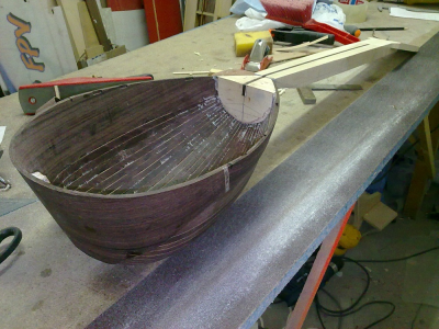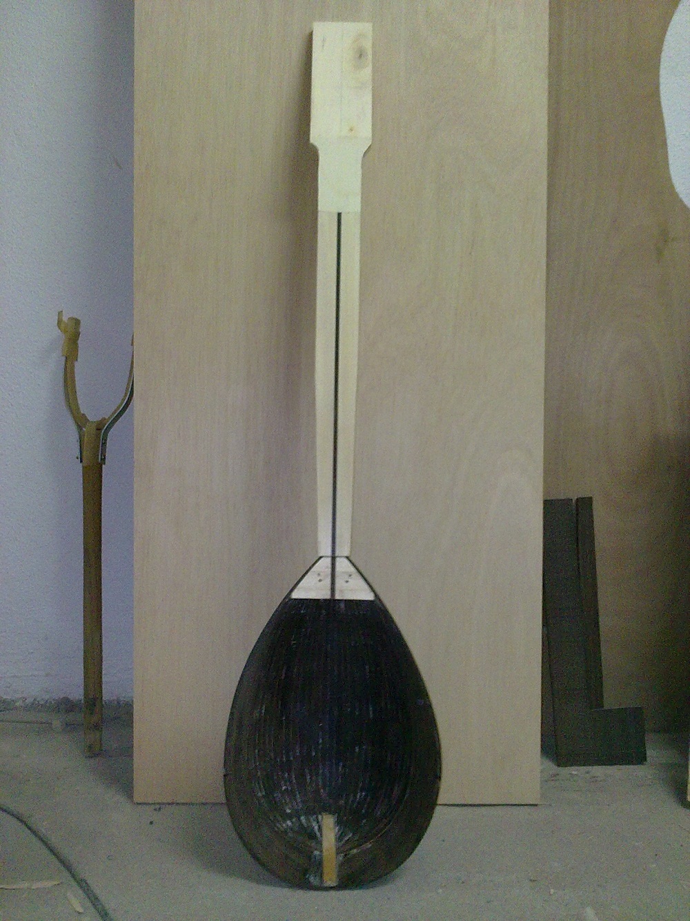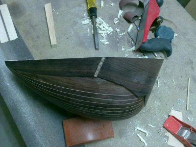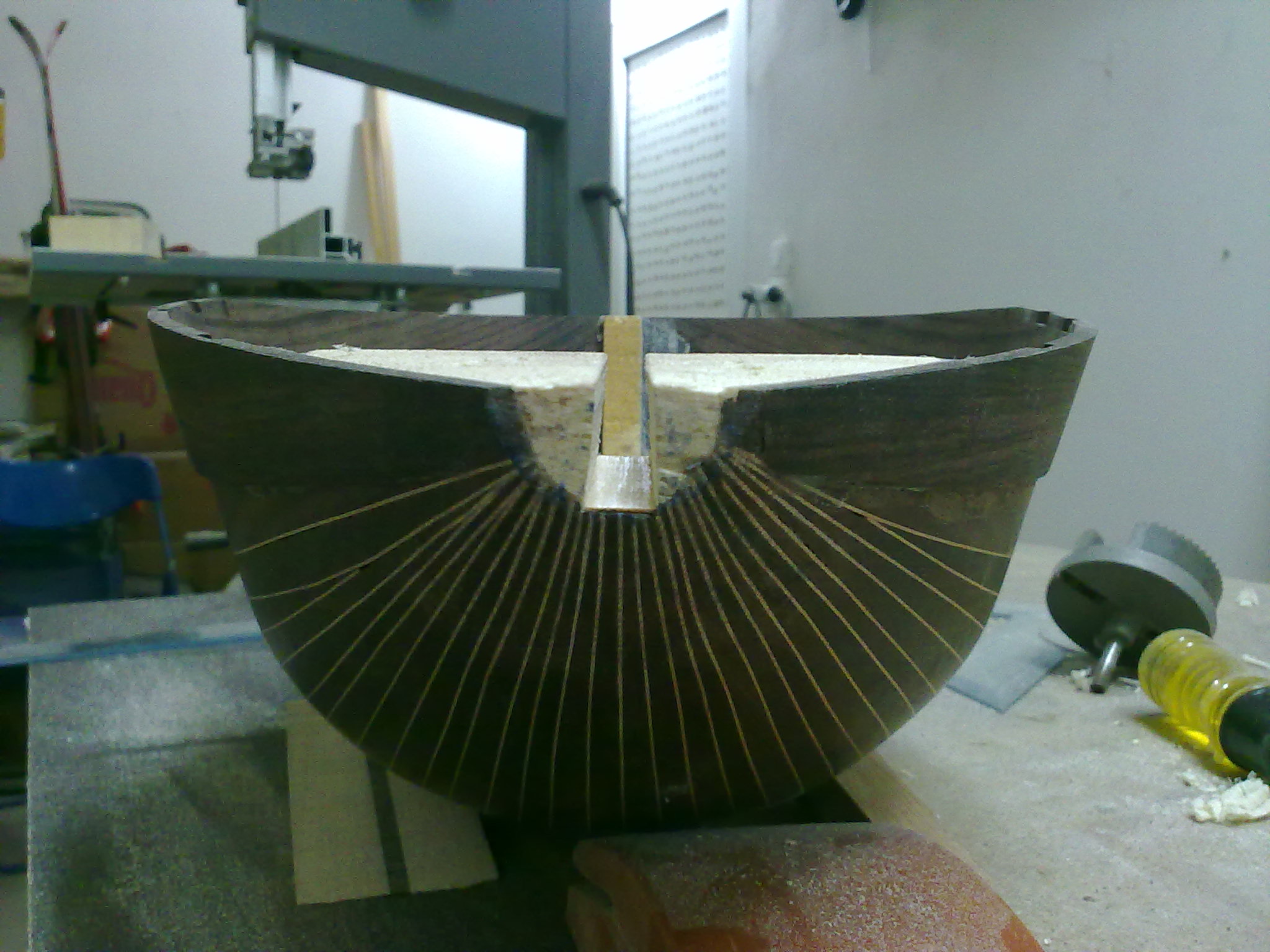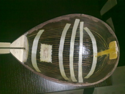 Ειναι η  δευτερη ολοκληρωμενη κατασκευη.Αλλο καλουπι μικροτερο απο το πρωτο.Η ιδιαιτεροτητα του ειναι το σπαστο καπακι,αλλοστε αυτος ειναι ο λογος που το ξεκινησα ,να πειραματιστω πανω σ'αυτο.Φυσικα ηθελα να δοκιμασω και τον παλισανδρο να δω πως δουλευεται και τι ηχο θα δωσει στο τελος,αυτο το περιβοητο ξυλο.Τα μικρα μαδερακια  που ειχα ηταν ακαταλληλα,εντελως ακαταλληλα ομως,καθολου ισοβενα,κυματοειδη νερα  και πλαγια,με αποτελεσμα κατα το λυγισμα να εχω σπασιματα αλλα και η ντουγα στο τελος να εχει ταση για στρεβλωση,τελος παντων το δουλεψα κι εγινε το σκαφος χωρις προβληματα χοντρα.Το μπρατσο ειναι βεγγε και φλαμουρι,καραολο λευκα,τακος λευκα.Το καπακι χαμηλης ποιοτητας,ελατο 3 ευρω,δεν εχει ακτινικη κοπη.Κοινως οτι απομειναρια  απο ξυλα ειχα τα εβαλα.Τωρα το τι θα βγει απο ηχο,ο θεος κι η ψυχη του.Προς το παρον αυτα.Λιγες φωτο απο τα μεχρι στιγμης σταδια κατασκευης: