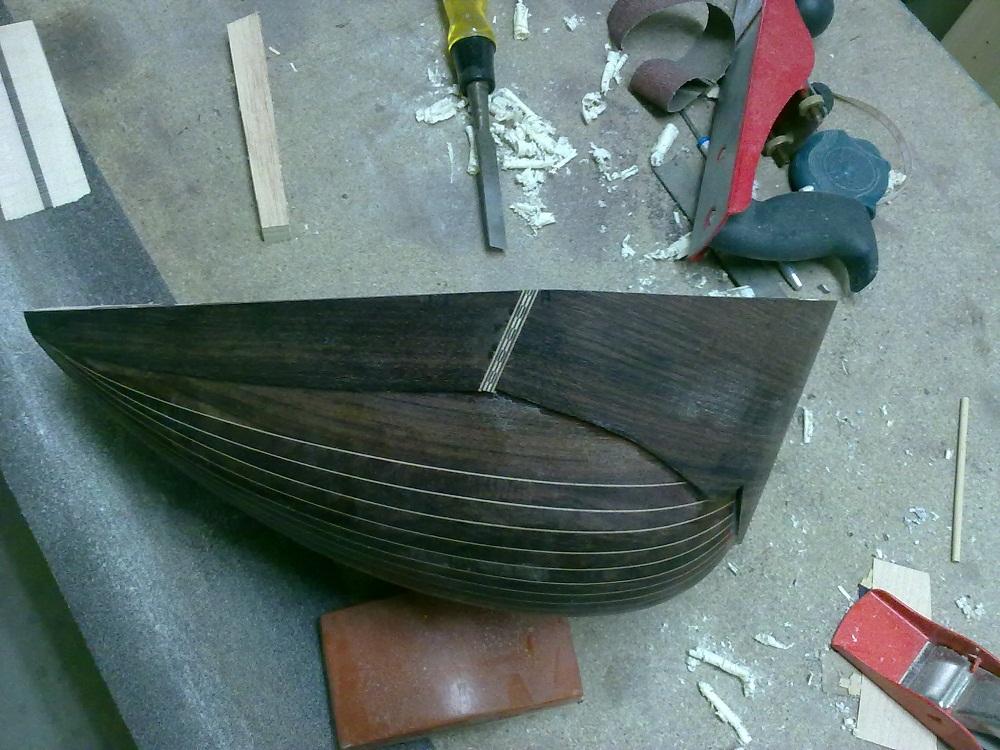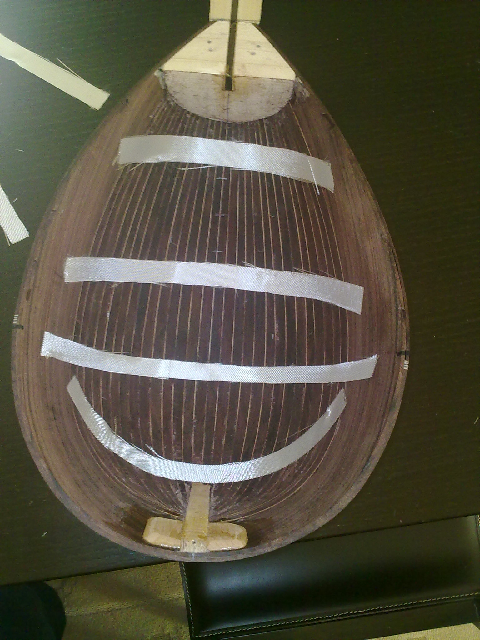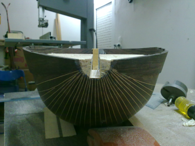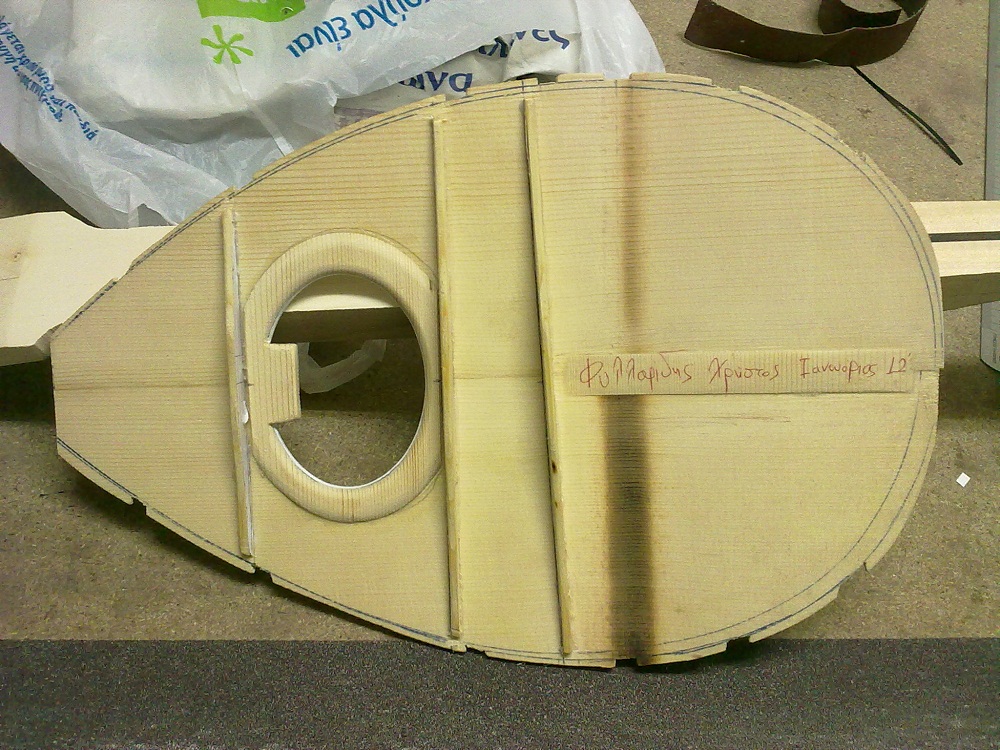 Ο τακος της χορδιερας ο οποιος μπηκε στο καλουπι πριν φτιαχτει το σκαφος,ειναι αυτο το ξυλακι και πιανει ισα ισα την περιοχη που συγκλινουν  και ενωνονται ολες οι ντουγες.Προρθεσα κατοπιν και δυο κομματια δεξια και αριστερα απο αυτο για να εχει περισσοτερο παχος το ξυλο οπου θα μπουν οι βιδες της χορδιερας.