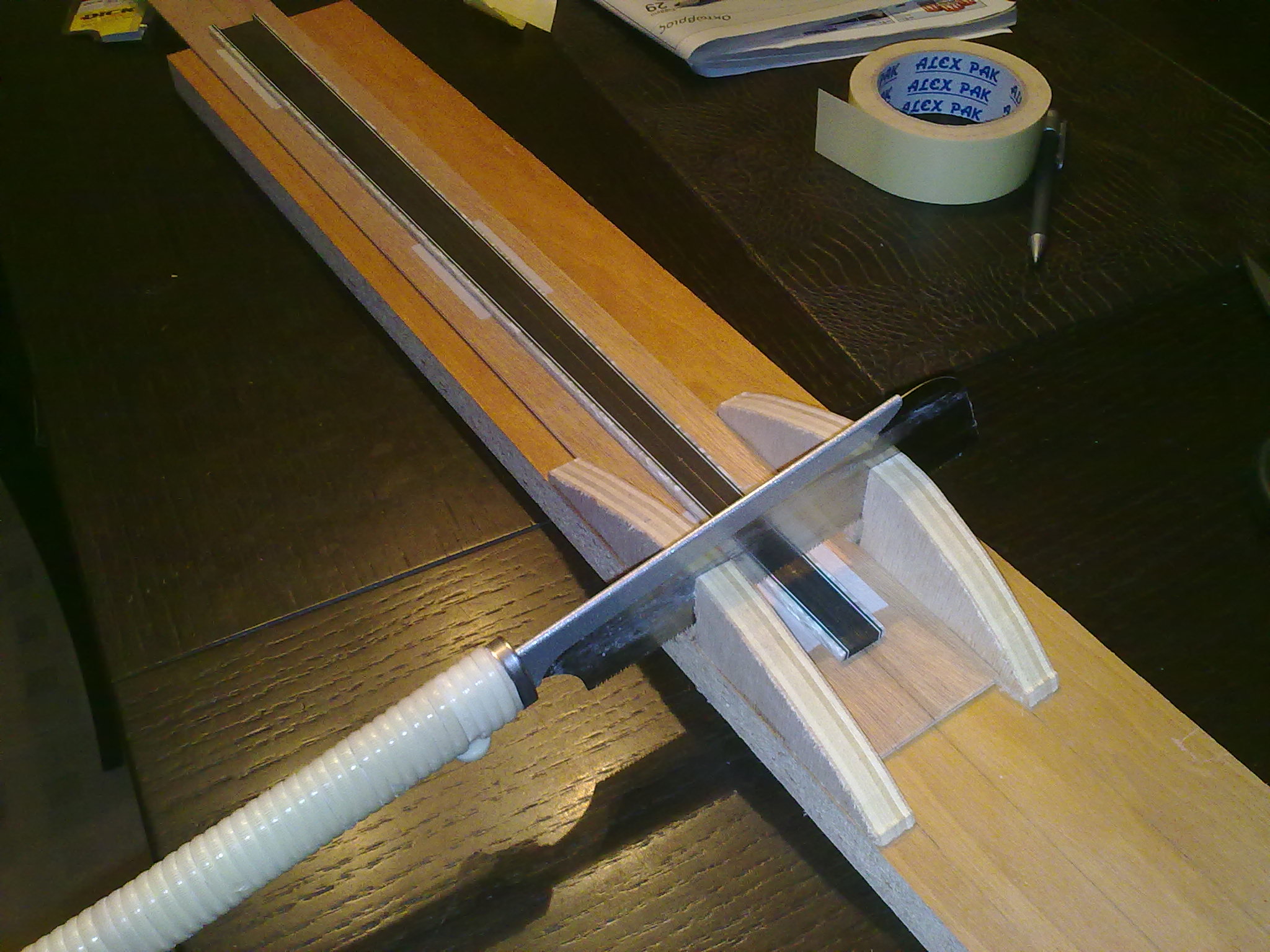 Βαγγελη  σε ευχαριστω. Λοιπον η πατεντα εχει ως εξης: σε ξυλο παχους 2-3 εκατοστων μηκος 80  και πλατος 10 ,εφτιαξα και κολλησα τους οδηγους αυτους που κρατανε το πριονι καθετο  σε ολους τους αξονες.Την  αποσταση μεταξυ των οδηγων την εκανα τετοια που χωραει μεχρι και ταστιερα ακουστικης κιθαρας , ειναι 6 εκατοστα.Στο μεσω ακριβως της αποστασης αυτης τραβηξα μια γραμμη κατα μηκος.Απο κοντρα πλακε εφτιαξα ενα κομματι 70 χ 6 εκατοστα και τραβηξα και σ αυτο την μεση γραμμη,στην ουσια ειναι ενα βαγονι που φερει επανω την καθε ταστιερα.Η καθε ταστιερα πληρως διαμορφωμενη φερει επισης την μεση γραμμη και κολλιεται με διπλης οψεως κολλητικη ταινια πανω στο βαγονι ετσι που ολες οι μεσες γραμμες να συμπιπτουν.Χρειαζεται προσοχη στην κατασκευη του βαγονιου και πρεπει το πλατος του να ειναι ακριβως οσο η αποσταση των οδηγων του πριονιου ,6 εκατοστα δηλαδη σε εμενα,πρεπει λιγο να σφηνωνει , βαζουμε σαπουνι στις ακμες του βαγονιου για να μπορει να γλιστραει και να κινειται κατα μηκος μονο,δεν πρεπει να εχει τζογο,αλλα και να αποκτησει με τον καιρο,γιαυτο ειναι χαραγμενες ολες οι μεσες γραμμες για να υπαρχει ελεγχος.Σαπουνι επισης βαζω καθε φορα και στη λαμα του πριονιου γιατι και αυτη σφηνωνει στους οδηγους.Ελπιζω να εγινα κατανοητος,εαν οχι ,μπορω να ανεβασω αναλυτικα φωτογραφιες της κατασκευης.