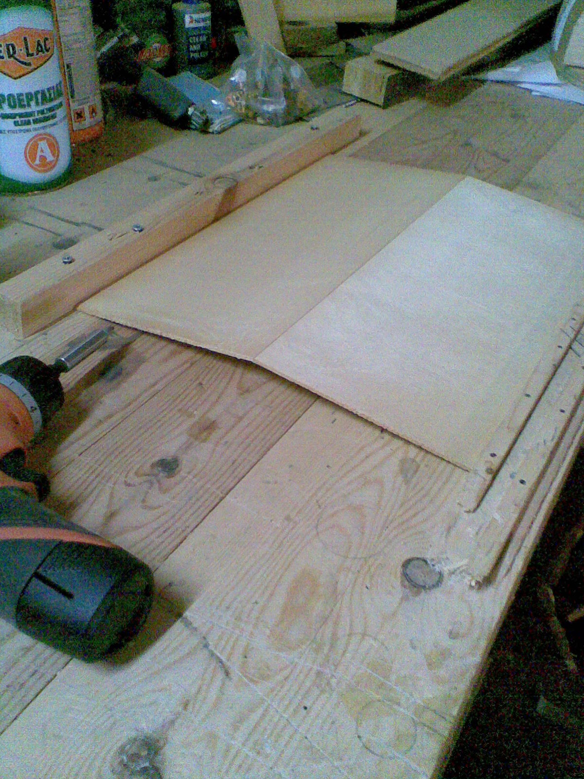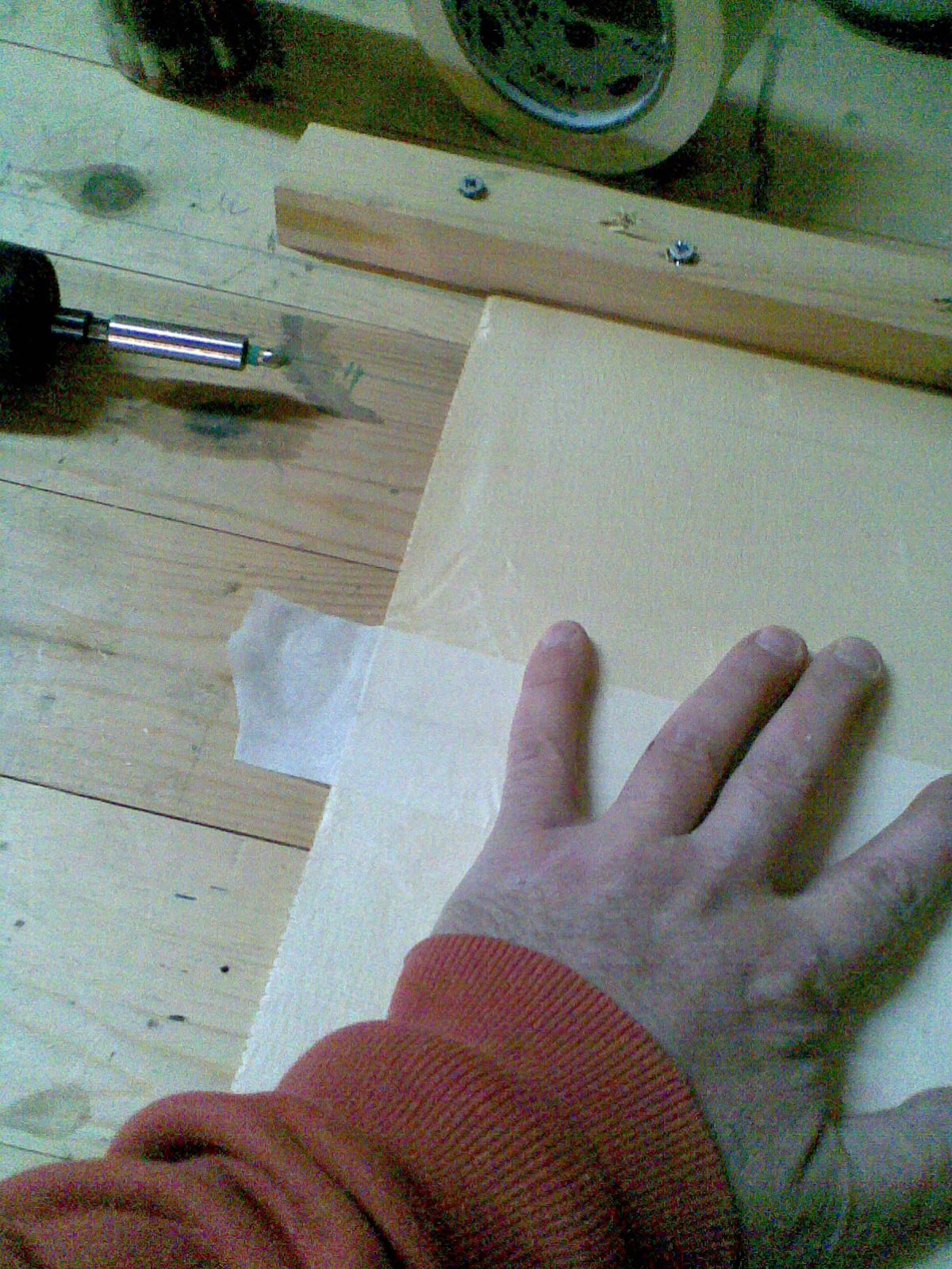Αφου βαλουμε κολα και τα πατησουμε, καθαριζουμε με σπατουλα γρηγορα, και βαζουμε χαρτοταινια κι απο αυτη την πλευρα οστε να μην μας κολησει στο βαρος που θα βαλουμε απο πανω αργοτερα.Στο διαστημα που εχουμε πατησει τα δυο ξυλα δεν αφηνουμε τα χερια μας, γιατι το καπακι θα γινει ελατηριο