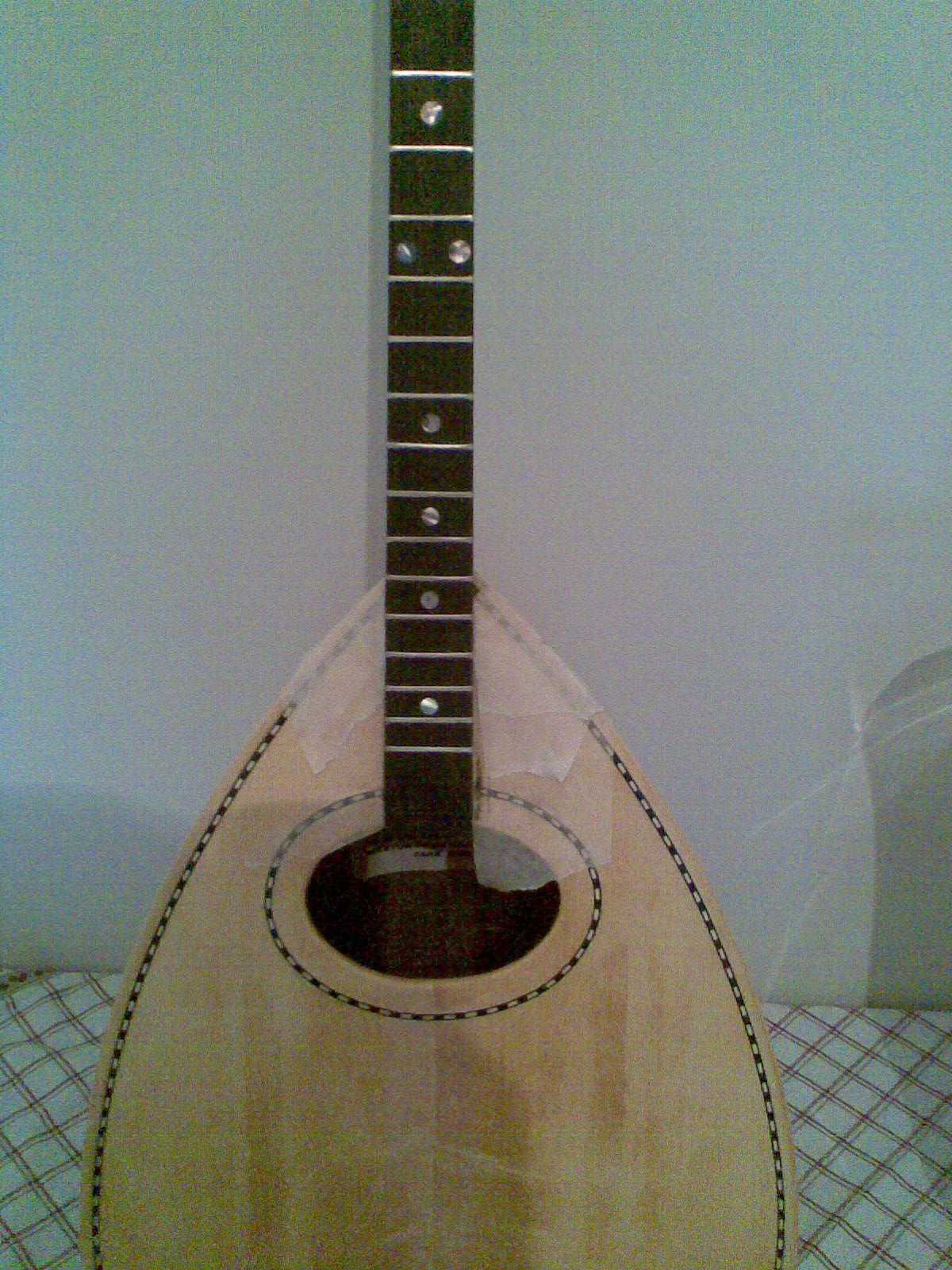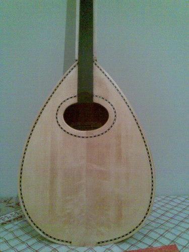 Μετα απο δυο εβδομαδες απουσιας επιστροφη.Ετσι ειναι το οργανο σημερα.Με κολημενη ταστιερα( αχαραχτη),και με κολημενο και διαμορφομενο καραολο.Κατα πασα πιθανοτητα θα του βαλω και μια παραδοσιακη φιγουρα που ειδα σε καποιο μπουζουκι.Οχι τιποτα δυσκολο, κατι απλο.Αλωστε ειμαι της αφαιρετικης σχολης.Το καπακι μολις βαφτηκε , παρουσιασε αυτα τα νερα που βλεπουμε.Ενω μου αρεσουν , θα προσπαθησω να καλυψω τα πανω με την φιγουρα, και τα κατω με την χορδιερα, που μαλον θα ειναι ξυλινη τυπου Καφετζοπουλου.