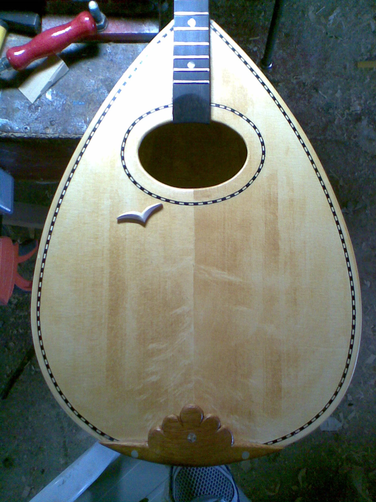 Έτσι όπως έβαλες τη φωτογραφία νόμισα ότι το τέλειωσες, το πέρασα για το δικό σου το μπουζούκι, πολύ ωραίο σχέδιο πάντως και νομίζω είσαι πολύ κοντά στο να το κάνεις ίδιο, τώρα δεν φαίνετε έντονη η διαφορά και το βάθος της χάραξης, αλλά απ τις φωτογραφίες δεν μπορείς να τα δεις όλα, όταν το περάσεις λούστρα θα φανεί το αποτέλεσμα όπως το άλλο στη φωτογραφία το λουστραρισμένο, μπράβο ρε Κώστα πολύ μ αρέσει αυτό το σχέδιο, θα το προσπαθήσω και εγώ αλλά σε άλλο όργανο γιατί τώρα το καράολο το έχω διαμορφώσει, μένει να μαζέψω τις ατέλειες με τρίψιμο μόνο. Άμα δεν βαριέσαι να γράφεις πες και τι ξύλα έχεις βάλει για μανίκι καράολο κτλπ.