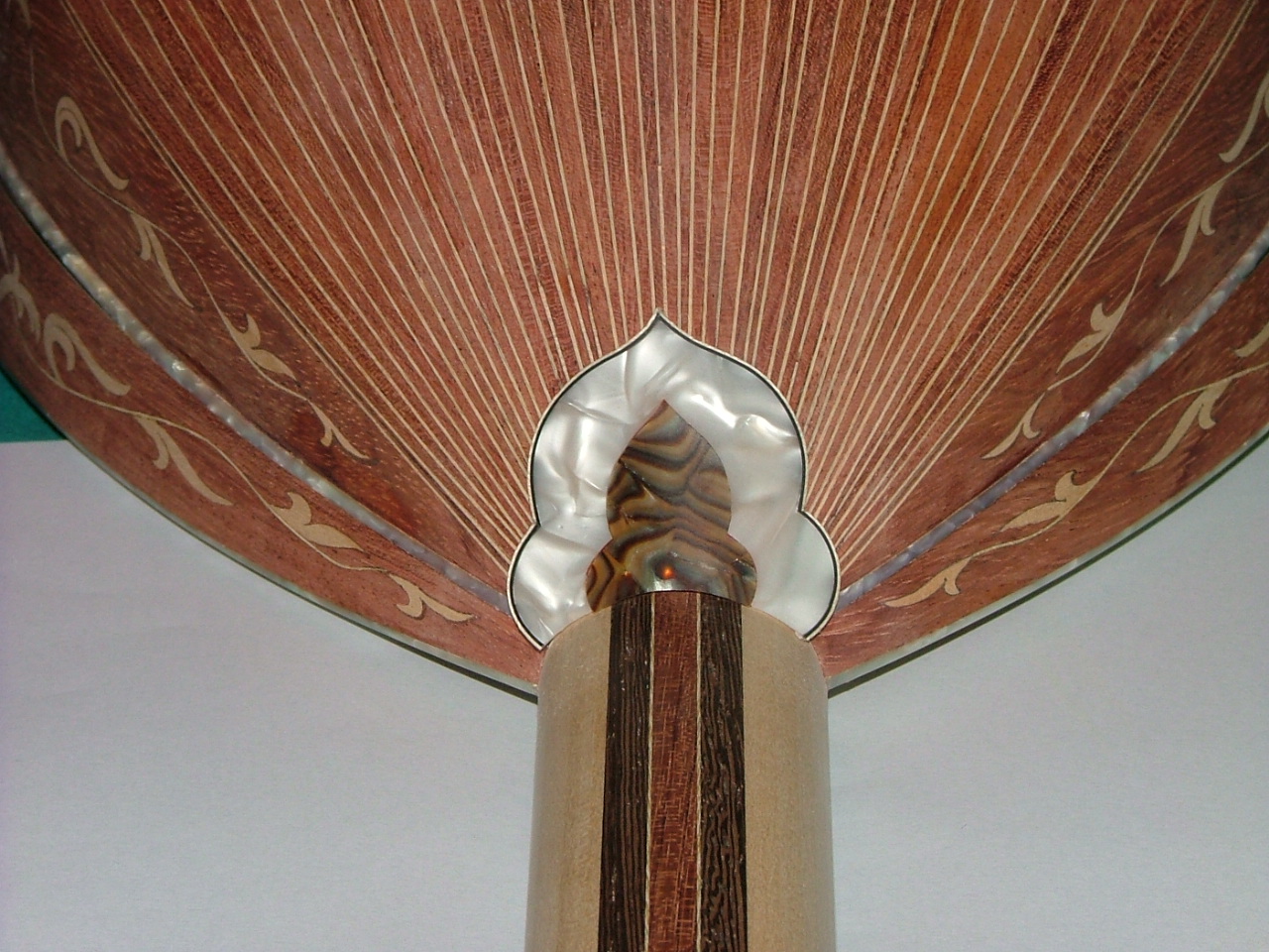 Κάποιες πληροφορίες. Το σκάφος κατασκευάστηκε από ντούγιες bubinga. Έχει δεκαπέντε πραγματικές ντούγιες, χαραγμένες στα τρία έτσι ώστε να φαίνονται σαρανταπέντε. Οι φιγούρες στα πλαϊνάρια, παραπέτια και κολάντζα είναι από φλαμούρι και καπλαμά cotto. Οι φιγούρες στο καπάκι είναι από bubinga το φόντο. Χρησιμοποιήθηκε ένα επιπλέον κομμάτι που έκοψα εφεδρικό για κολάντζα και λεπτύνθηκε από τα τρία χιλιοστά στο ένα με το χέρι (ξύστρα, γυαλόχαρτο κλπ). Τα σχέδια είναι επίσης φλαμούρι, ενώ τα λουλουδάκια celluloid. Στο φόντο δεν χρησιμοποίησα καπλαμά που είχα προμηθευτεί για αυτή την δουλειά, γιατί αισθητικά ήταν πολύ καλύτερο αυτό που τελικά έκανα και ας ήταν σκότωμα. (η διαφορά φαίνεται αν δείτε την επένδυση του πίσω μέρους του καράολου).