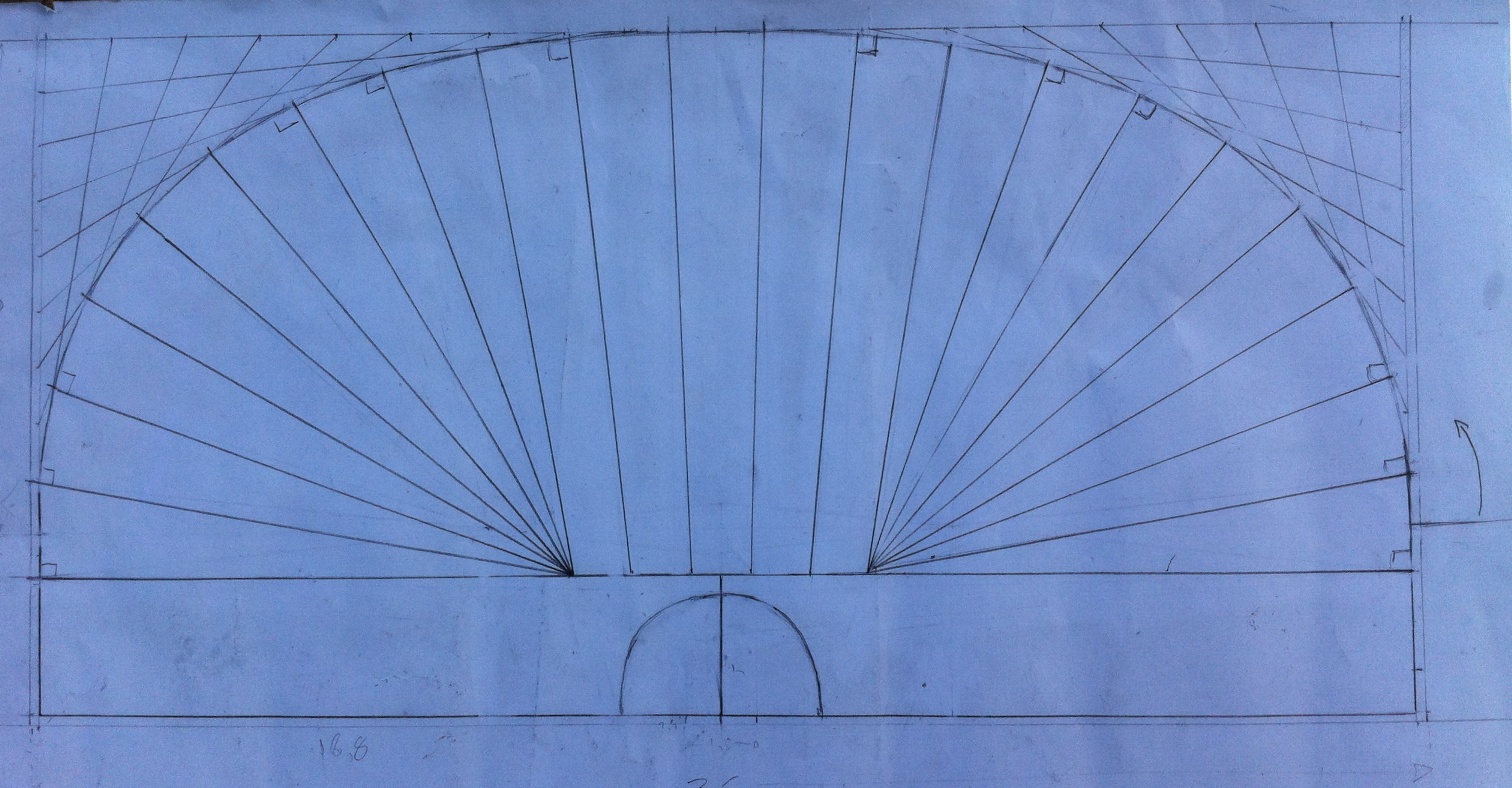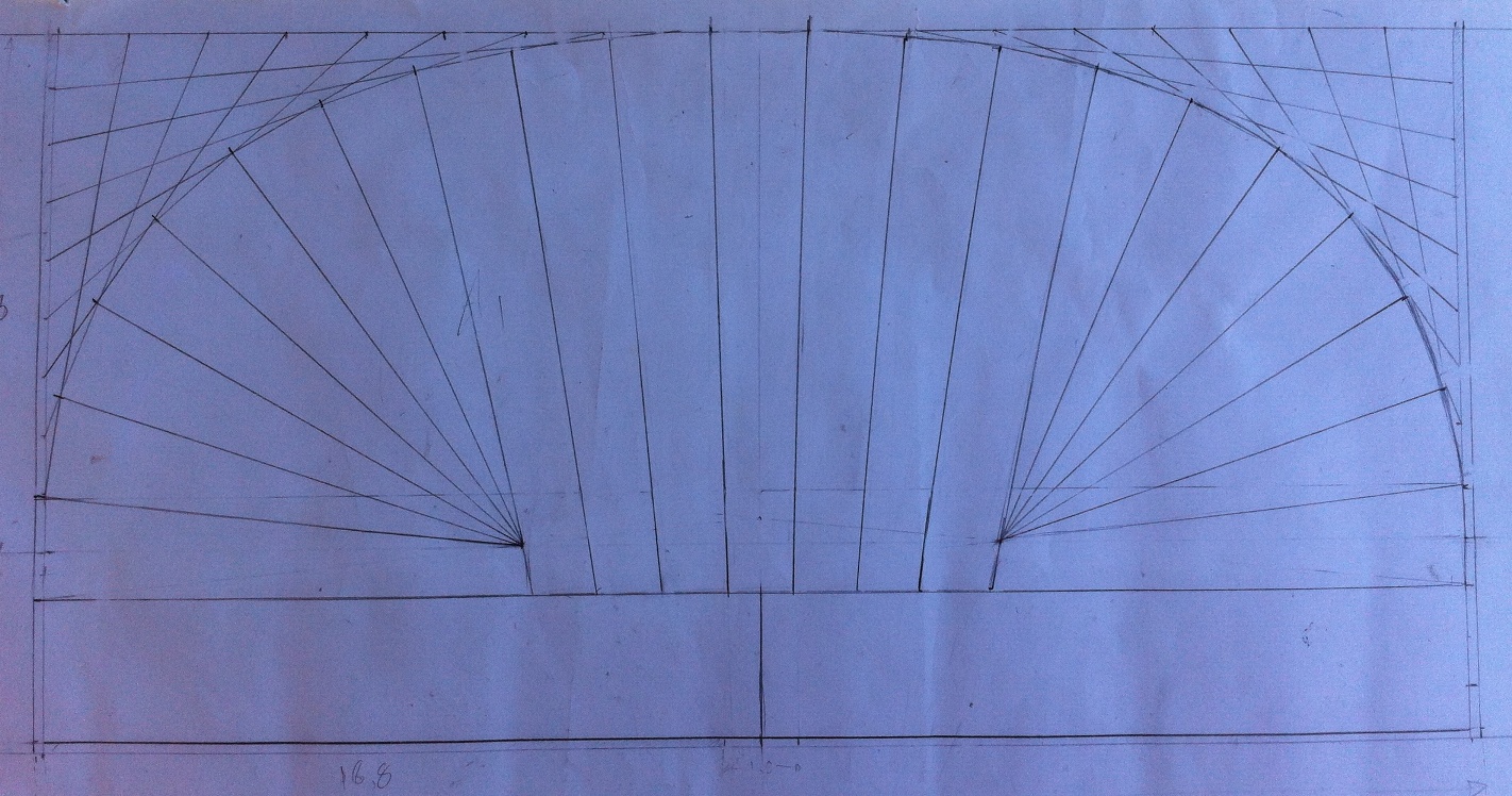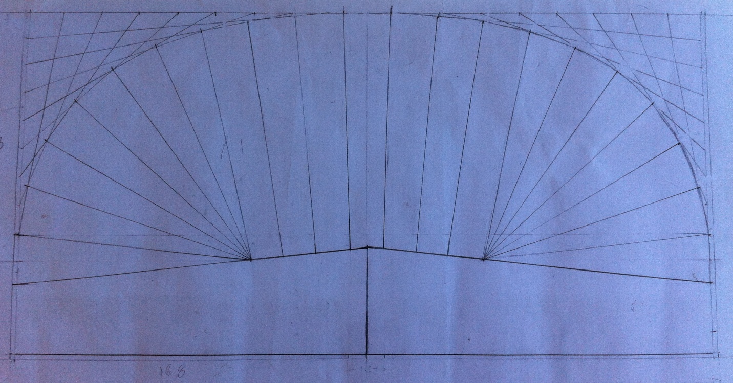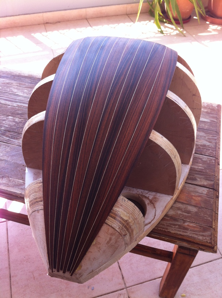 Επηδή το σκάφος των λαούτων, έχει δύο σημεία που συγκλείνουν οι ντούγιες στο πίσω μέρος, παρατήρησα πώς προκύπτει στρέβλωση των ντούγων ώστε να καταλήξουν σε ένα κέντρο μπροστά στο σημείο του μπράτσου.Για την επίτευξη όσο λιγότερο δυνατής στρέβλωσης έπρεπε τα δύο κέντρα πίσω να ρθούν όσο πιο κοντά γίνεται στο κέντρο.Ολα αυτά χωρίς να υπάρξει αμβλεία γωνία στις ντουγιες περιμετρικά με μέγιστη γωνία την ορθή(...έτσι θα θέλει πλανιάρισμα απο την μία της μόνο μεριά ;) ). Έπητα απο πολλές ώρες δοκιμών και σπαζοκεφαλιάζματος κατέληξα στον παρακάτω τρόπο. Λύγισα 2 ντούγιες έτσι και πατήσαν καλά.Ελπίζω να βγεί σωστός...