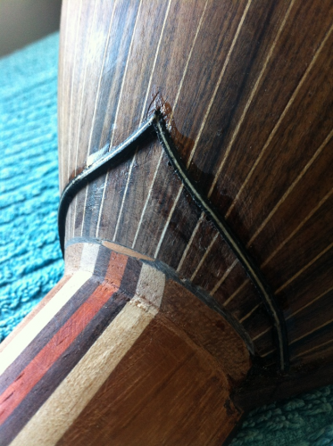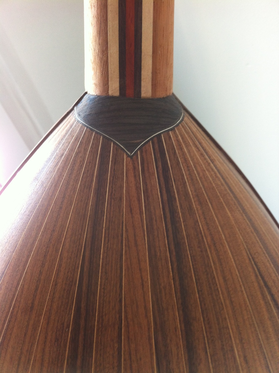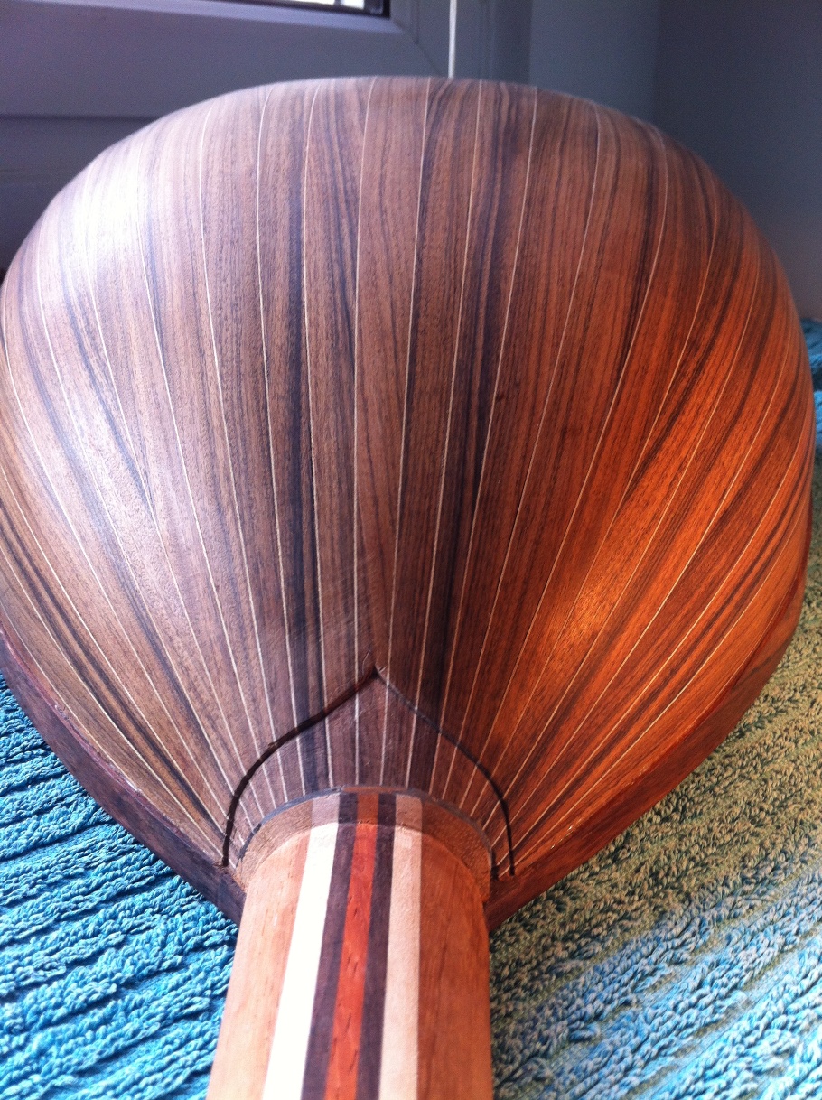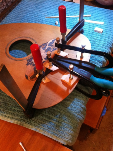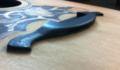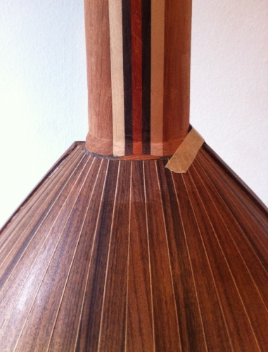 Κόπηκε ,τρίφτηκε και κολλήθηκε κι ο καβαλάρης.....και φτάσαμε πλέον πρίν το κόλλημα του καπακιού.  Εμπότισα το καπάκι από μέσα με πολύ αραιωμένη ψαρόκολλά και "μπό μαντραγκάντε" (ή κάπως έτσι...) που μου έδωσε και συνέστησε άκρως αναγνωρισμένος οργανοποιός. Πήρα λοιπόν και ένα πυκνωτικό μικρόφωνο και έκατσα  και μέτρησα τις συχνότητες καπακιού και σκάφους...το σκάφος μου δίνει 3 κορυφές στα 160,231,275Hz  και το καπάκι 4 κορυφές στα 82,149,188,347Hz. Καμιά ιδέα κανείς...;