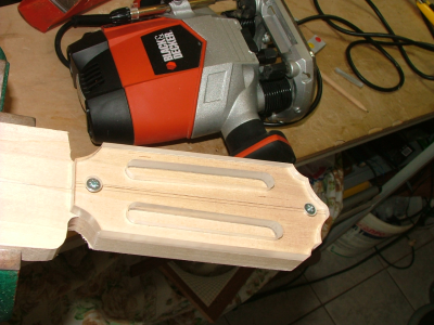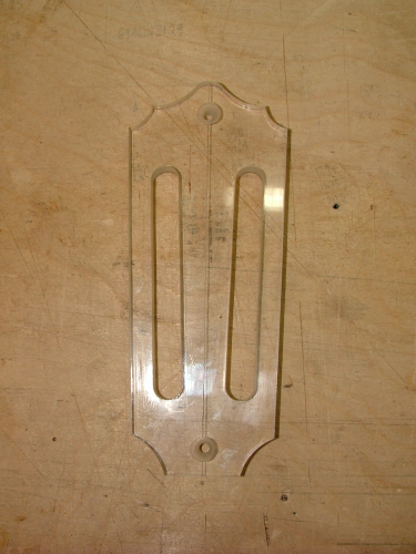 Το template κόπηκε σε plexiglass πάχους 8 χιλιοστών και όπως φαίνεται έχει χαραχθεί ο άξονας συμμετρίας, στο μηχάνημα κοπής. Στην συνέχεια άνοιξα δύο τρύπες πάνω στο άξονα συμμετρίας ώστε να βιδώνεται ο οδηγός πάνω στο κομμάτι του ξύλου που θα γίνει καράολο και το κεφάλι των βιδών να μην προεξέχει.