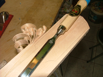 Αφού τοποθετηθεί ο οδηγός πάνω στο κομμάτι του ξύλου που θα γίνει καράολο, έτσι ώστε ο άξονας συμμετρίας του να συμπίπτει με τον άξονα συμμετρίας του ξύλου ( που έχουμε χαράξει), ξεγυρίζουμε το εξωτερικό περίγραμμα με το ρούτερ