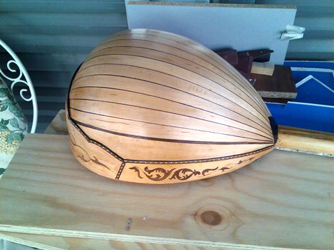 ¨Εγινε εξ ολοκλήρου στό σπίτι χωρίς κάν μόρσα, γιαυτό δέν είναι καί τό καλύτερο άν και στίς φωτογραφίες από κινητό δείχνω τή μόστρα πού λέμε. ¨Εξυπνος ο βλάχος. Σκάφος κελεμπέκι, 15 δούγιες μαύρο φιλετάκι ,καπάκι έλατο μέ φυγούρα μαρκιτερί καπλαμά, ροζέτα από ξύλο καρυδιά καί σελουλόιντ φιλετάκι πλαστικό   κορδόνια τίς πλάκας ξύλινα ότι είχα πρόχειρο καί έτσι τό ντιζάιν δέν είναι καί τό καλύτερο, μάνικο έβενος μέ κλάρα από κελεμπέκι κλίμακα 67  κόντρες 2 από κερασιά 1 από κελεμπέκι τά πλαινά από φλαμούρι φιλέτα πλαστικά, καράολο από φλαμούρι μέ φιγούρα από μαρκιτερί καπλαμά, κολάντσα κελεμπέκι καριδιά , τό ίδιο καί τά παραπέτια, λούστρο δύο χέργια γομαλάκα κόστος μιά έξοδο σέ ταβέρνα .  Λάθη πολά τό χειρότερο δέν είχα τά εργαλεία γιά νά τά διορθόσο.
