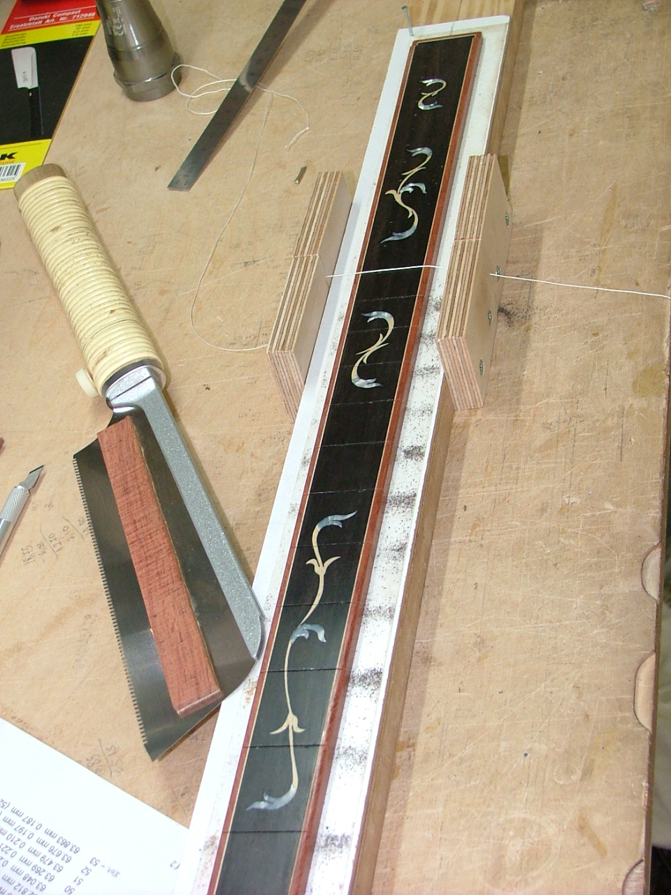 ;Dγια να είμαι σίγουρος ότι θα κόψω στο σωστό σημείο (δηλαδή ότι οι σχισμές των οδηγών και το σημάδι του αντίστοιχου τάστου είναι αλφαδιασμένα, έχω βάλει την κλωστή και κάνω επιβεβαίωση.