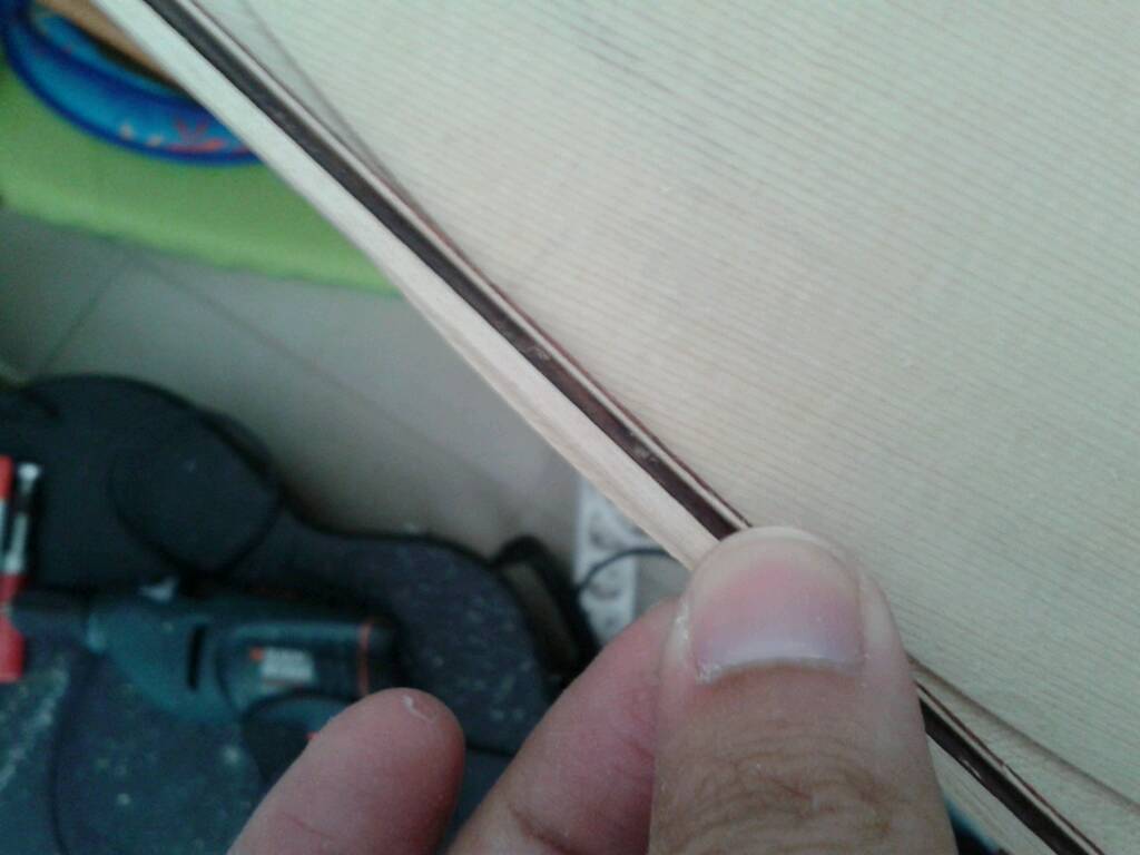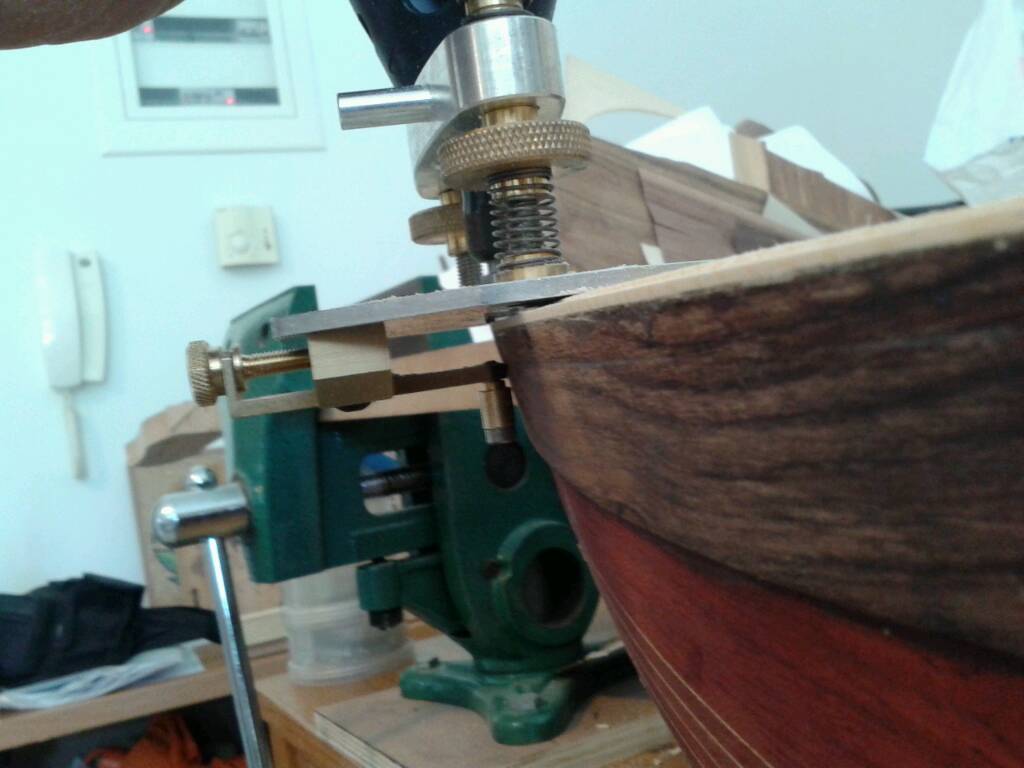 Αυτο το ριμαδι το εργαλειο του stewmac (το προσαρτημα για τα περιμετρικα φιλετα) ειναι για κιθαρες που το σωμα πεφτει καθετα απο το καπακι. Στο μπουζουκι το σκαφος μπαινει προς τα μεσα. Αποτελεσμα αυτου ηταν να φαω λιγο περισσοτερο καπακι. Ειχα κανει βλεπετε δοκιμη σε ενα μαδερι ....